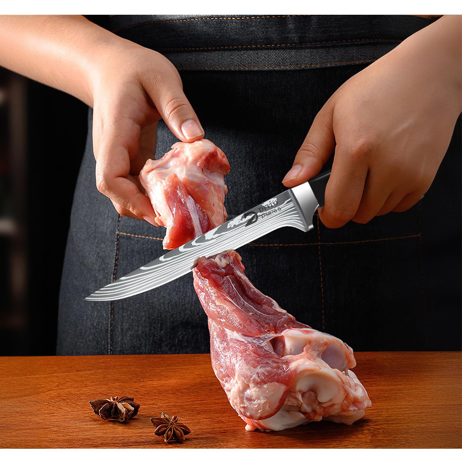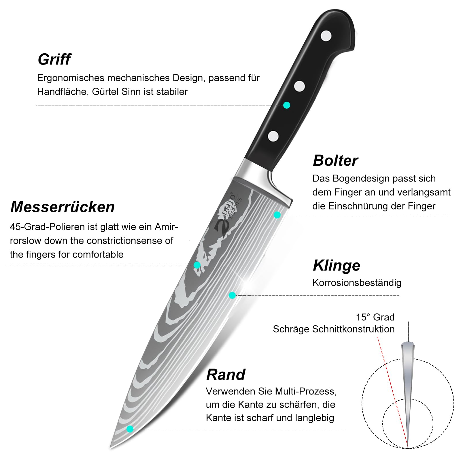 Das Set bietet eine vielseitige Auswahl für alle Küchenaufgaben. Es enthält typischerweise ein Kochmesser, Brotmesser, Tranchiermesser, Santokumesser, Universalmesser, Schälmesser, Ausbeinmesser sowie einen Wetzstahl, um die Messer scharf zu halten.