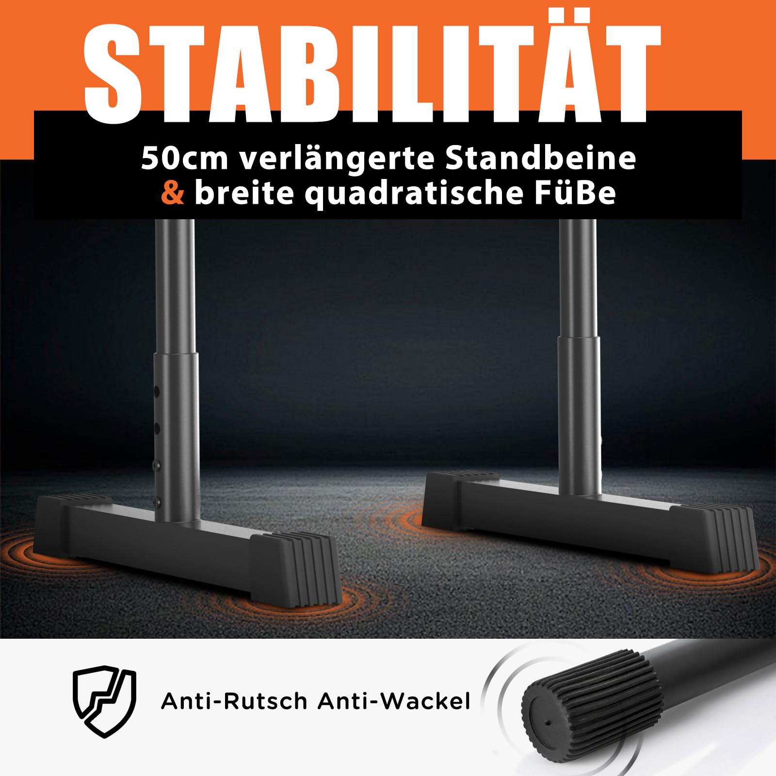 Äusserst stabil. Die Konstruktion aus hochwertigem Legierungsstahl und die 52 cm breiten Standfüsse mit rutschfesten Gummikappen garantieren einen absolut sicheren Stand. Sie sind für eine maximale dynamische Belastung von 200 kg ausgelegt, ideal für intensive Calisthenics- und Krafttraining-Einheiten.