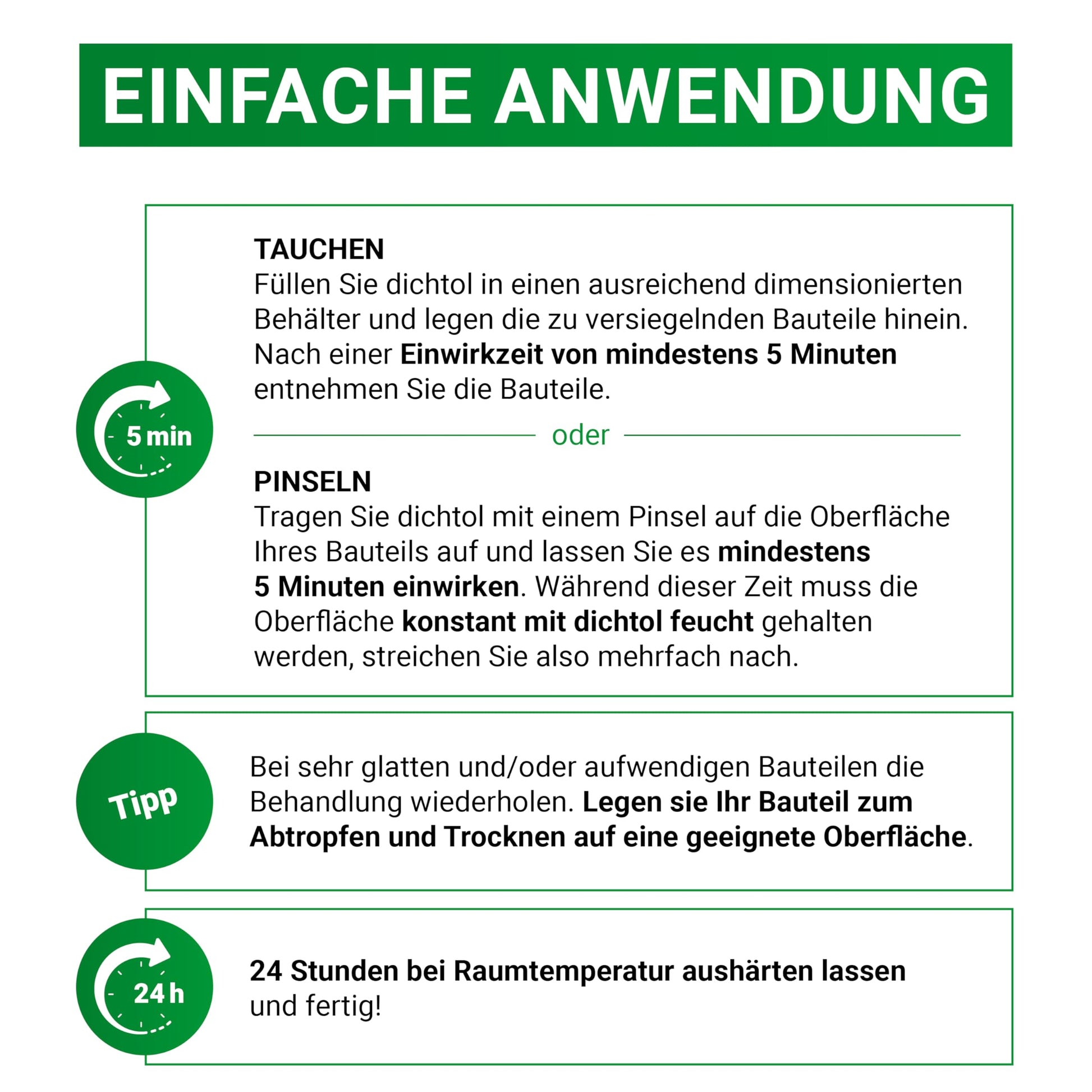 Die Anwendung ist sehr einfach und flexibel. Je nach Bauteil können Sie die Versiegelung durch Tauchen, Sprühen, Streichen oder Injizieren auftragen. Ein grosser Vorteil ist, dass keine Wärme zum Aushärten benötigt wird – das Produkt härtet vollständig bei Raumtemperatur aus.