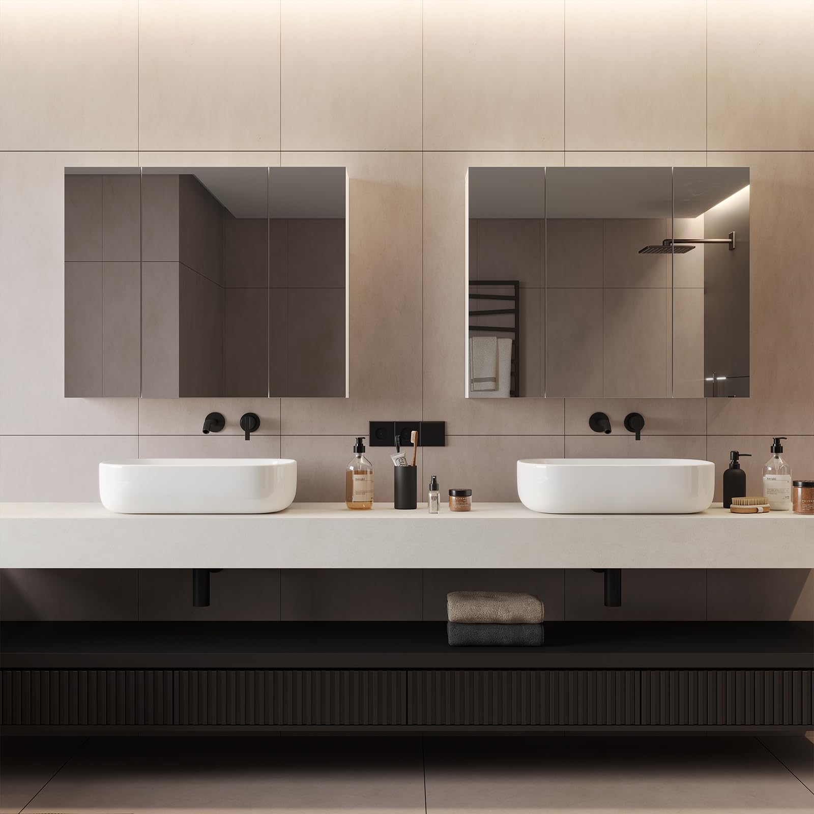 Dieser elegante Spiegelschrank mit drei Türen ist die ideale Lösung, um Stil und Ordnung in Ihr Badezimmer zu bringen. Er kombiniert ein modernes, geradliniges Design mit durchdachter Funktionalität für den täglichen Gebrauch.
