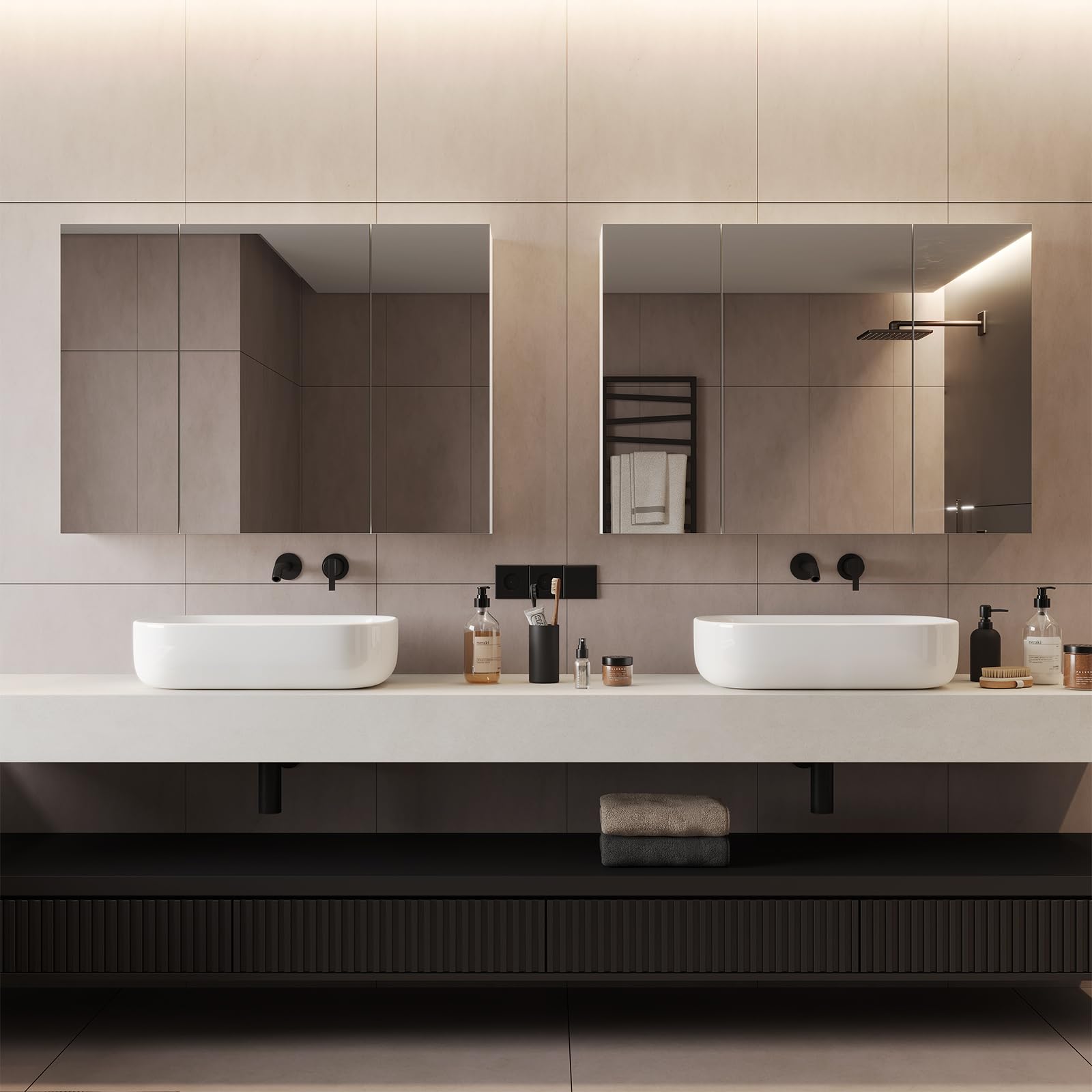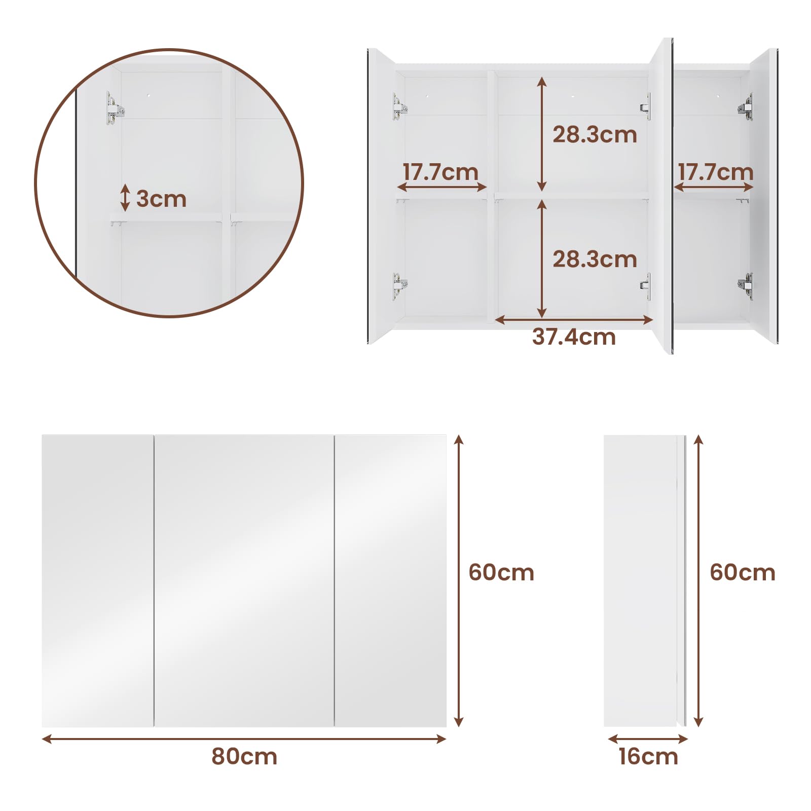 Der Spiegelschrank misst 80 cm in der Breite, 60 cm in der Höhe und 16 cm in der Tiefe. Im Inneren befinden sich Einlegeböden, die auf drei verschiedenen Höhen montiert werden können, sodass Sie den Stauraum individuell für Kosmetika, Pflegeprodukte und andere Utensilien anpassen können.