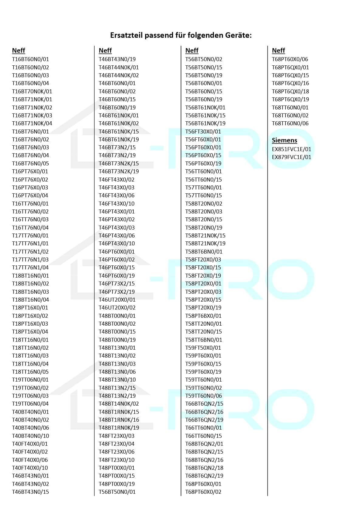 Neff Modelle: T16BT60N0, T16BT70N0K, T16BT71N0K, T16BT76N0, T16PT76X0, T16TT76N0, T17TT76N0, T17TT76N1, T18BT16N0, T18PT16X0, T18TT16N0, T19TT06N0, T40BT40N0, T40FT40X0, T46BT43N0, T46BT44N0K, T46BT60N0, T46BT61N0K, T46BT73N2, T46BT73N2K, T46FT43X0, T46PT43X0, T46PT60X0, T46PT73X2, T46UT20X0, T48BT00N0, T48BT13N0, T48BT13N2, T48BT14N0K, T48BT1RN0K, T48FT23X0, T48PT00X0, T56BT50N0, T56BT60N0, T56BT61N0K, T56FT30X0, T56FT60X0, T56PT60X0, T56TT60N0, T57TT60N0, T58BT20N0, T58BT21N0K, T58BT6BN0, T58FT20X0, T58PT20X0, T58PT6BX0, T58TT20N0, T58TT6BN0, T59FT50X0, T59PT60X0, T59TT60N0, T66BT6QN2, T66TT60N0, T68BT6QN2, T68PT60X0, T68PT6QX0, T68TT60N0