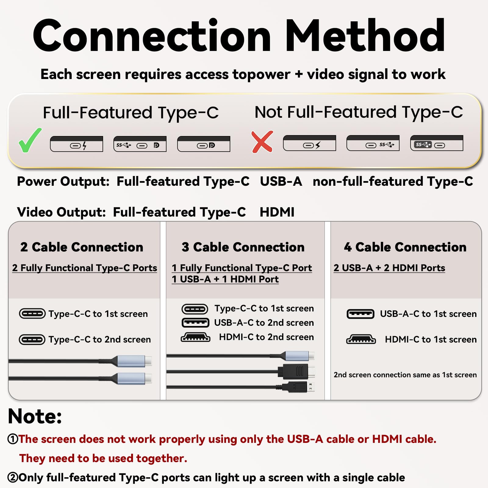 Die Einrichtung ist dank Plug-and-Play sehr einfach. Die Stromversorgung und das Videosignal erfolgen idealerweise über ein einziges USB-C/Type-C-Kabel pro Bildschirm. Falls Ihr Laptop dies nicht unterstützt, können Sie HDMI für das Video und einen separaten USB-Anschluss für die Stromversorgung nutzen. Der Extender wird nicht direkt am Laptop befestigt, was Schäden am Gehäuse vermeidet.