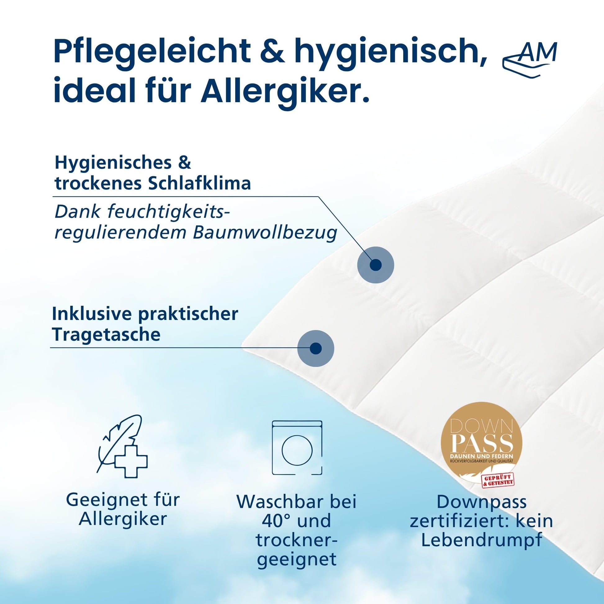 Diese Decke ist ideal für die kalte Jahreszeit (Wärmegrad 4-5) und Personen, die schnell frieren oder in kühlen Schlafzimmern schlafen. Dank des Nomite-Siegels ist sie zudem hervorragend für Hausstauballergiker geeignet.