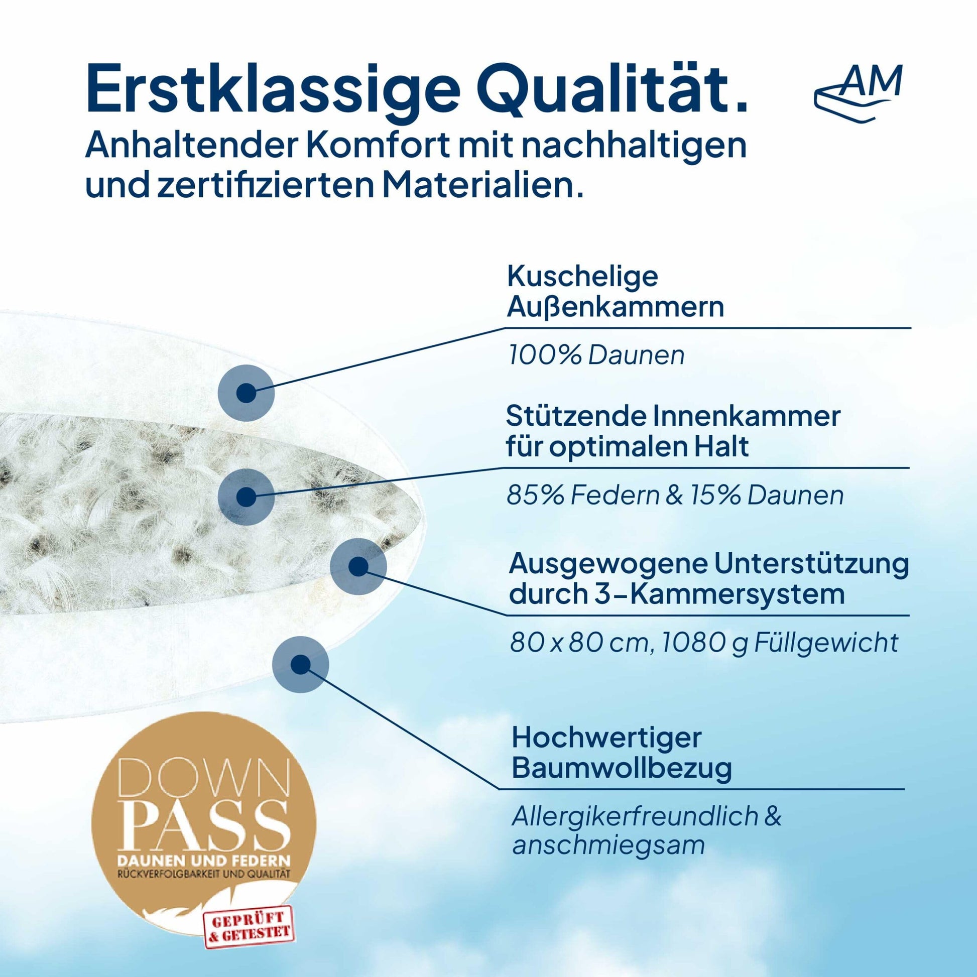 DormiGood Daunenkissen 3-Kammer Kopfkissen - 80x80 cm