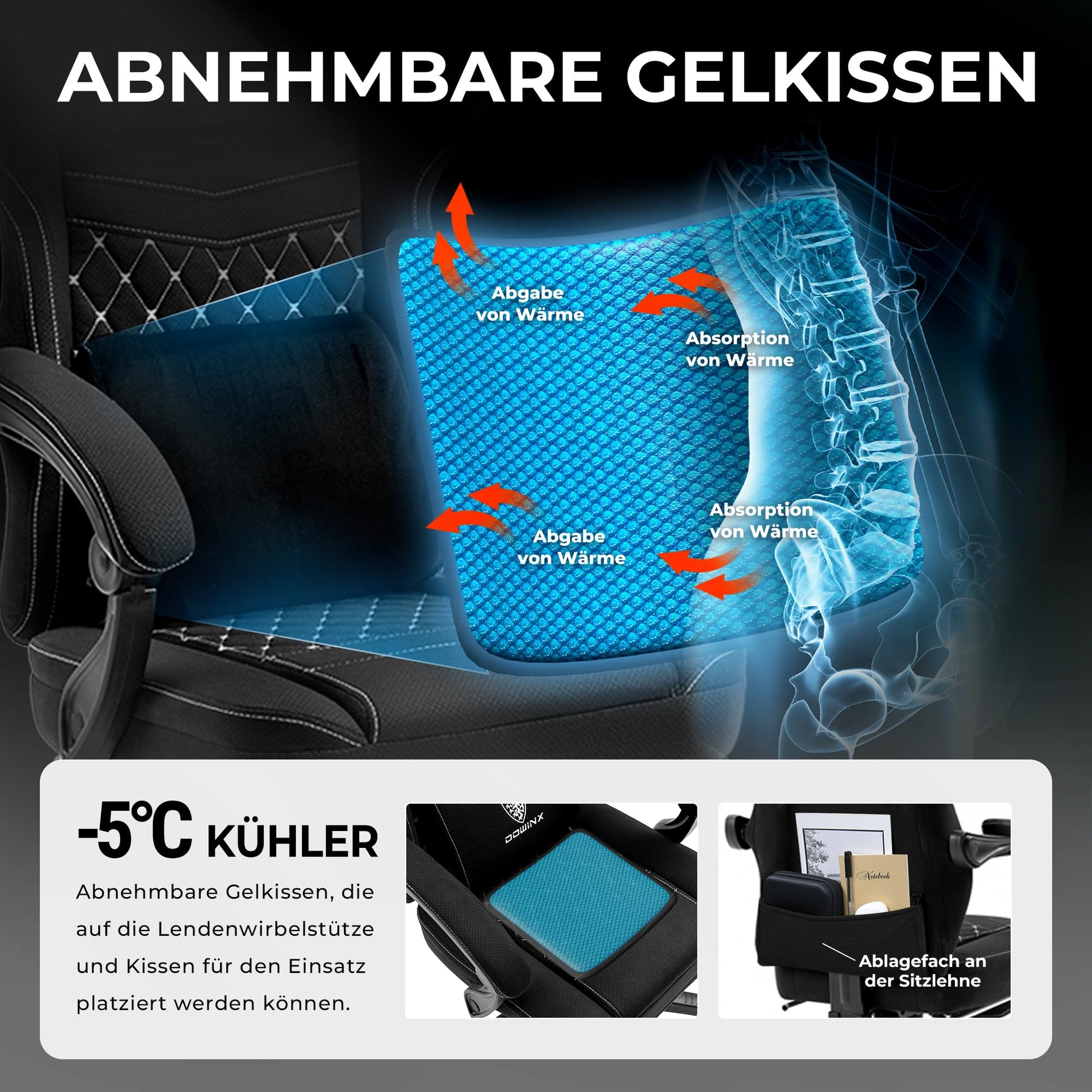 Der Stuhl kombiniert stützende Taschenfedern mit atmungsaktivem Kühlschaum. Diese innovative Polsterung sorgt für eine ideale Druckverteilung, verhindert einen Wärme- und Feuchtigkeitsstau und garantiert so auch bei langen Gaming- oder Arbeitssessions ein kühles und bequemes Sitzgefühl.