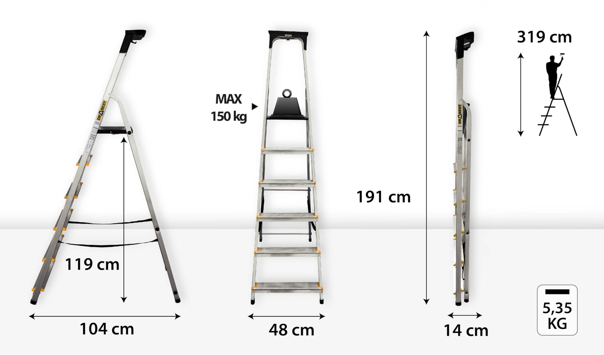 - Hohe Stabilität und Sicherheit: Ausgestattet mit breiten, geriffelten Aluminiumstufen und rutschfesten Füssen für einen jederzeit sicheren Stand.