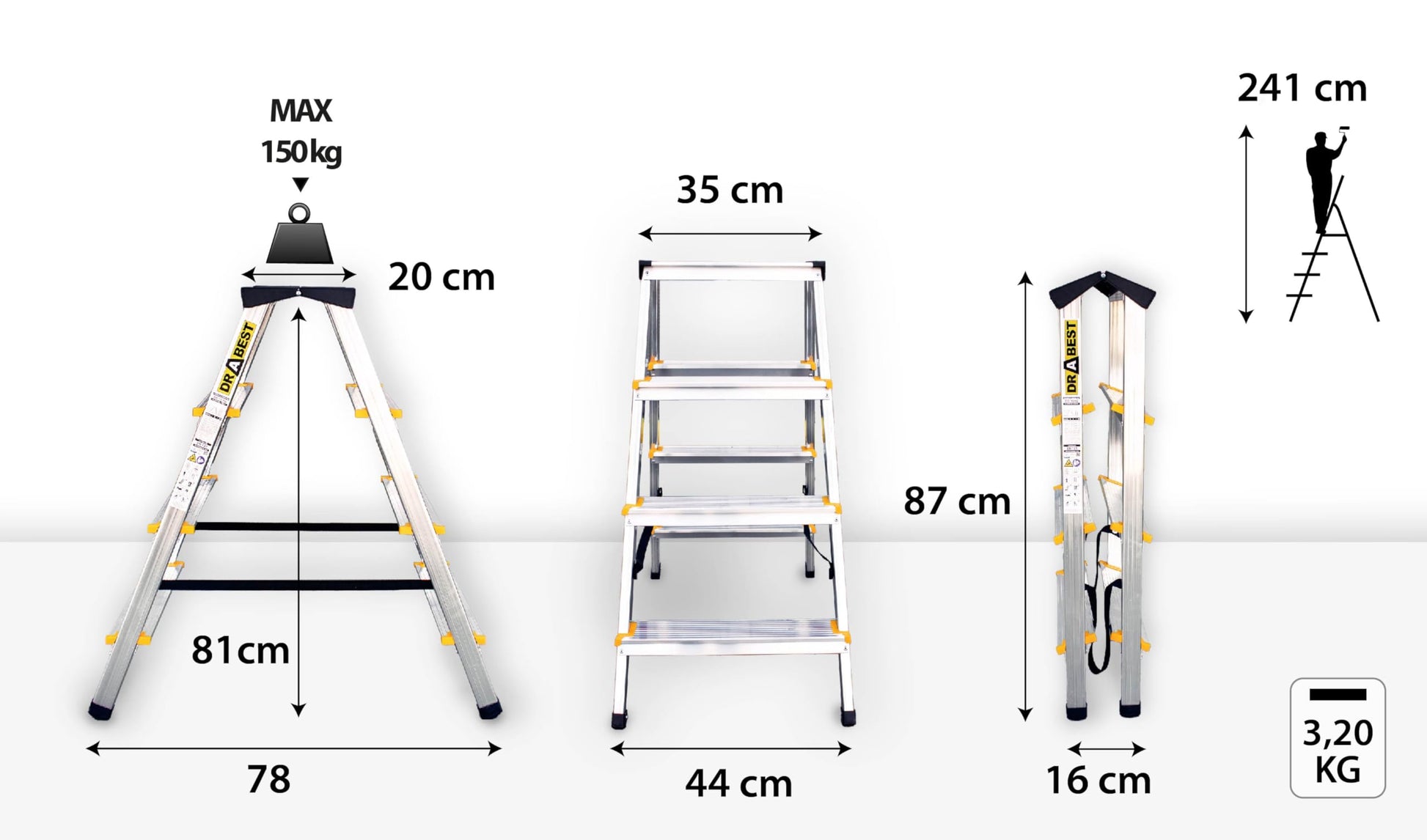 Sie erreichen eine maximale Arbeitshöhe von ca. 2,81 m. Zusammengeklappt ist die Leiter äusserst kompakt und passt mit ihren geringen Massen (ca. 87 cm hoch und 16 cm tief) platzsparend in fast jede Nische.