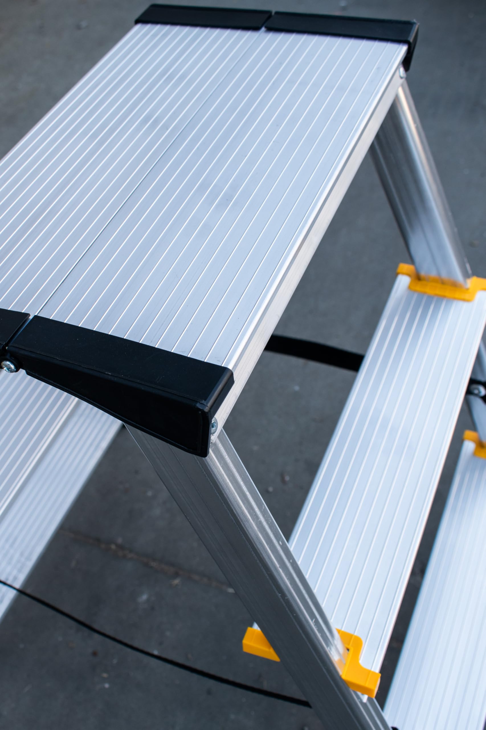 Dieser beidseitig begehbare Klapptritt aus Aluminium ist der ideale und sichere Helfer für sämtliche Arbeiten im Haushalt, in der Werkstatt oder im Gewerbe, vom Fensterputzen bis zu kleinen Renovationen.