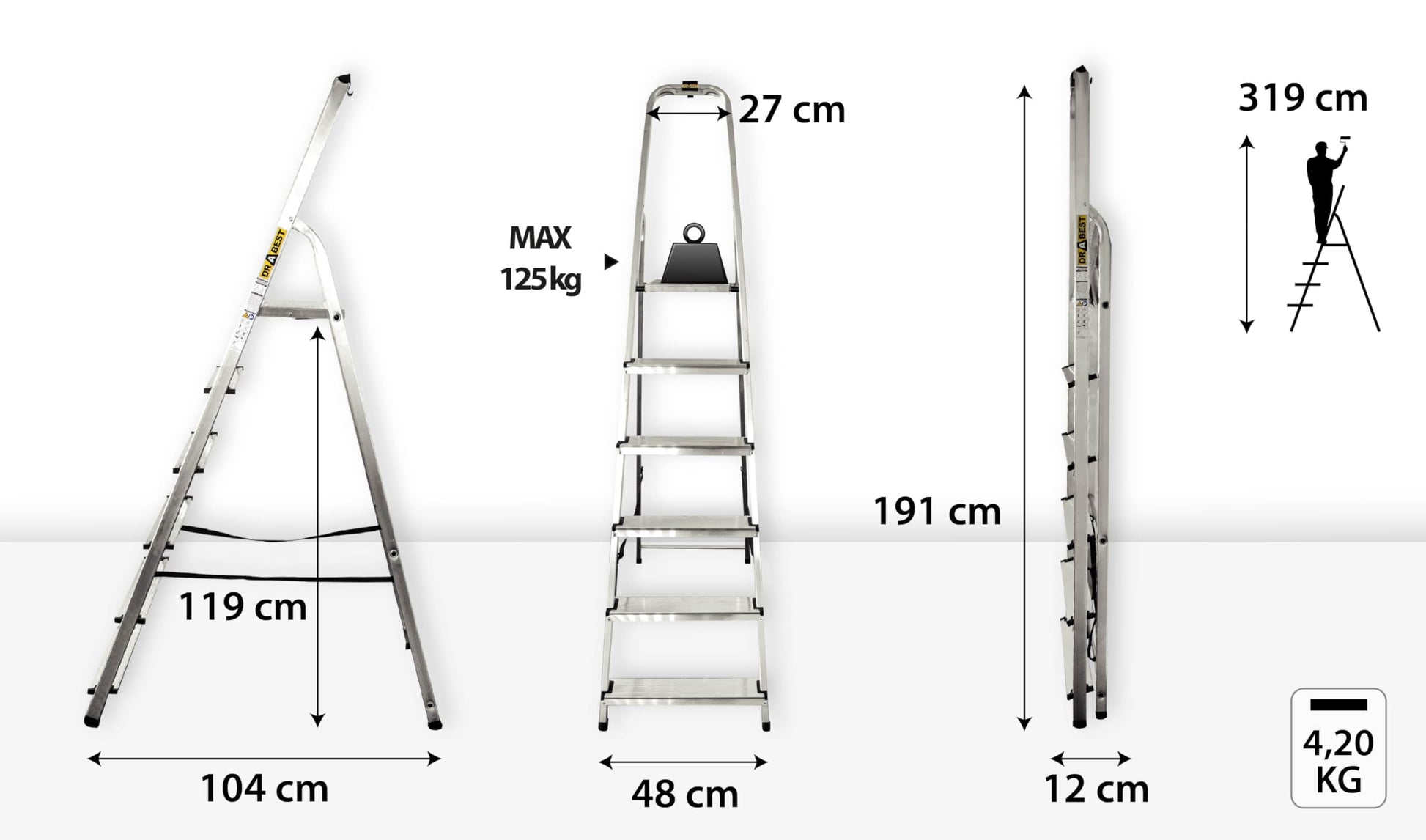 - Sicherer Stand: Sechs breite, geriffelte Aluminiumstufen und rutschfeste Füsse sorgen für maximale Stabilität.