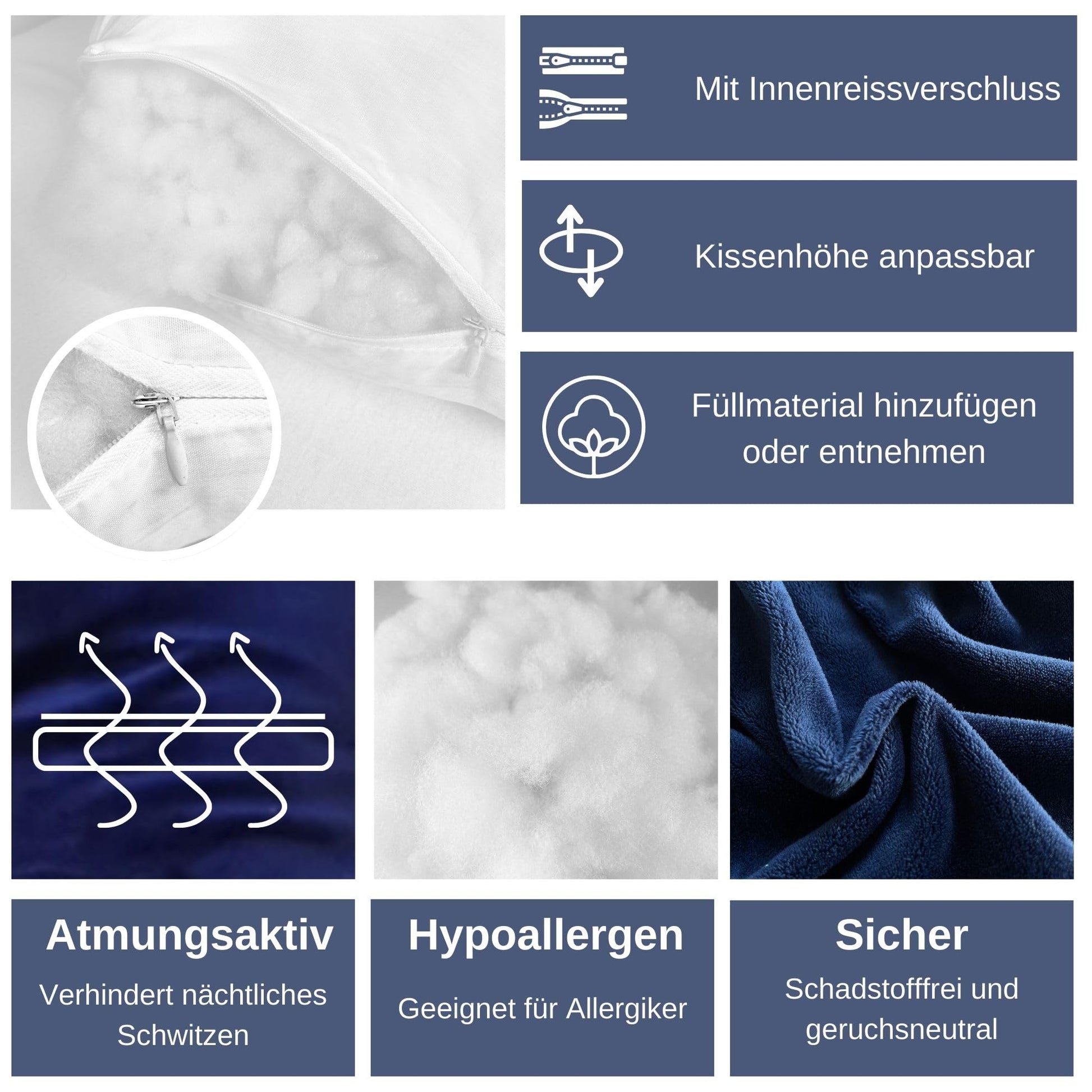Die Reinigung ist sehr einfach. Der hautfreundliche Baumwollbezug ist mit einem Reissverschluss abnehmbar und kann für maximale Hygiene in der Maschine gewaschen werden. Es wird empfohlen, nur den Bezug zu waschen, um die Form und Qualität der Füllung langfristig zu erhalten.