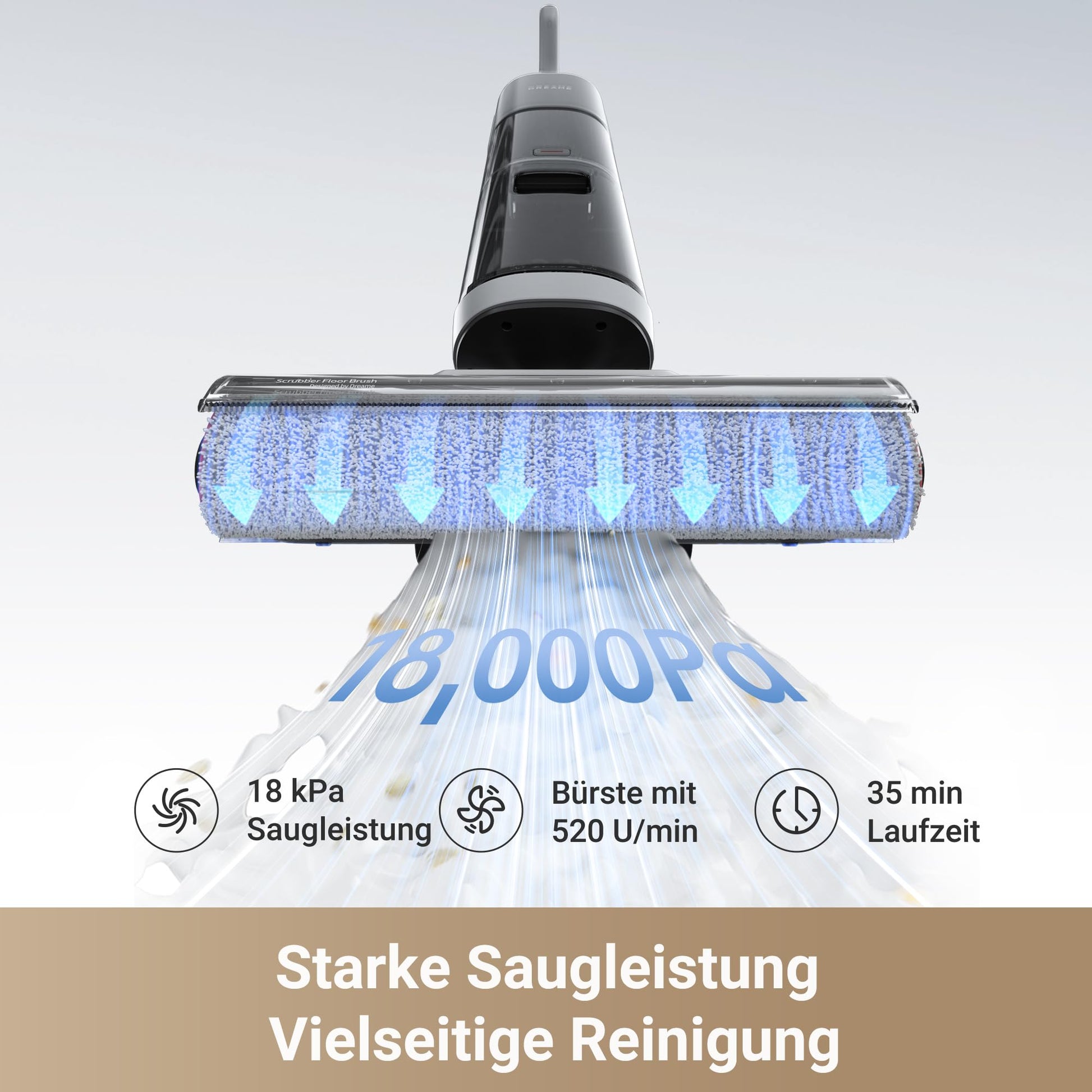 Die Kombination aus einer enormen Saugkraft von 18'000 Pa und einer schnellen Bürstenrotation von 520 U/min sorgt für ein makelloses, streifenfreies Ergebnis. Da die Bürste auf beiden Seiten bis an den Rand reinigt, werden auch Fussleisten und Ecken lückenlos und effizient sauber.