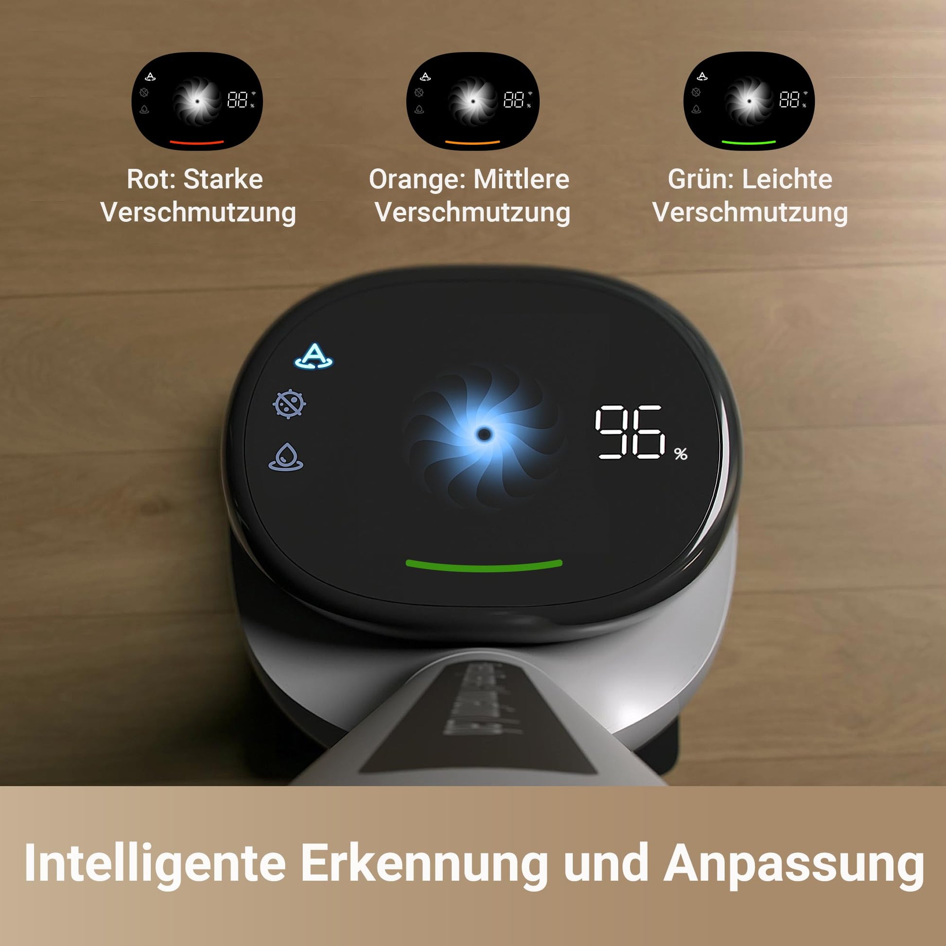 Ja, der dreame H14 wurde für eine lückenlose Reinigung konzipiert. Seine Bürstenrolle ist auf beiden Seiten randlos, sodass sie direkt an Fussleisten und in Ecken reinigt. In Kombination mit der starken Saugkraft von 18'000 Pa sorgt dies für ein makelloses Ergebnis ohne schmutzige Streifen.