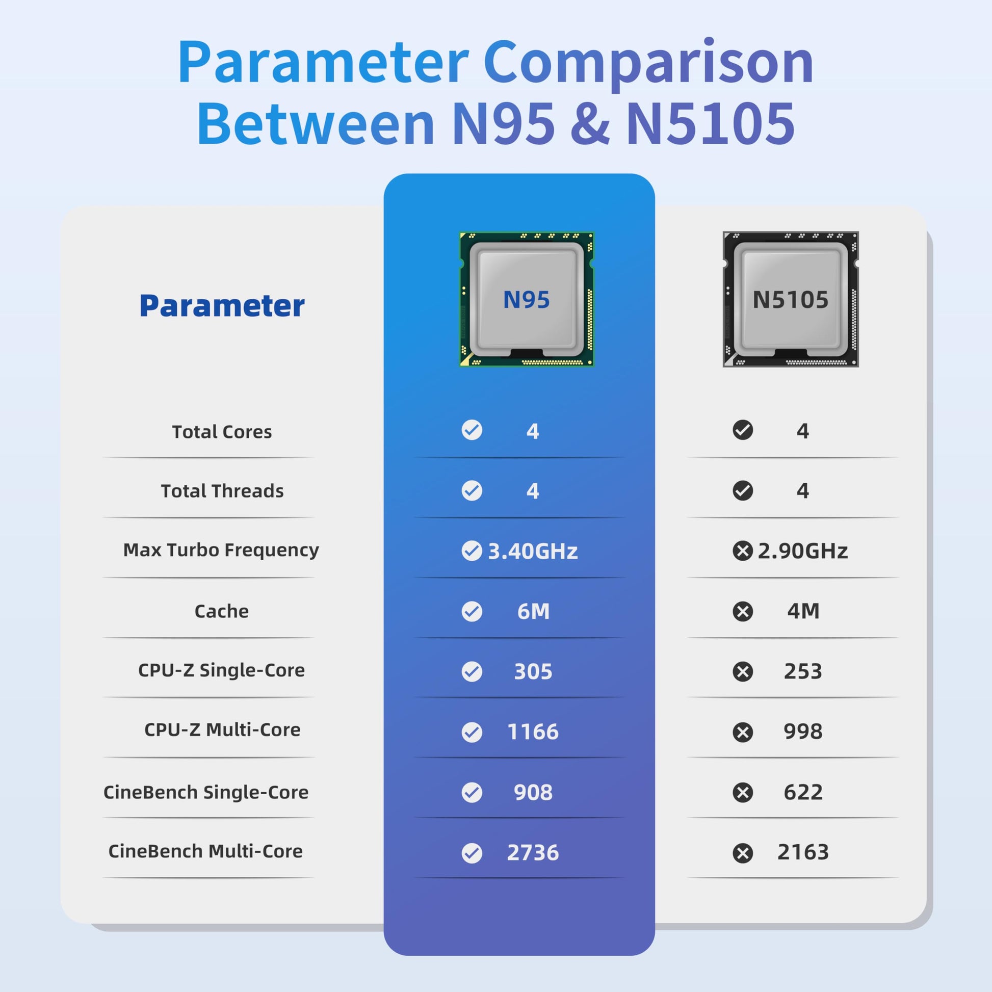 - Leistungsstarker Prozessor: Ausgestattet mit einem aktuellen Intel Alder Lake N95 Prozessor (bis zu 3.4 GHz), der bei niedrigem Stromverbrauch von nur 15W eine signifikant höhere Leistung als Vorgängermodelle bietet.