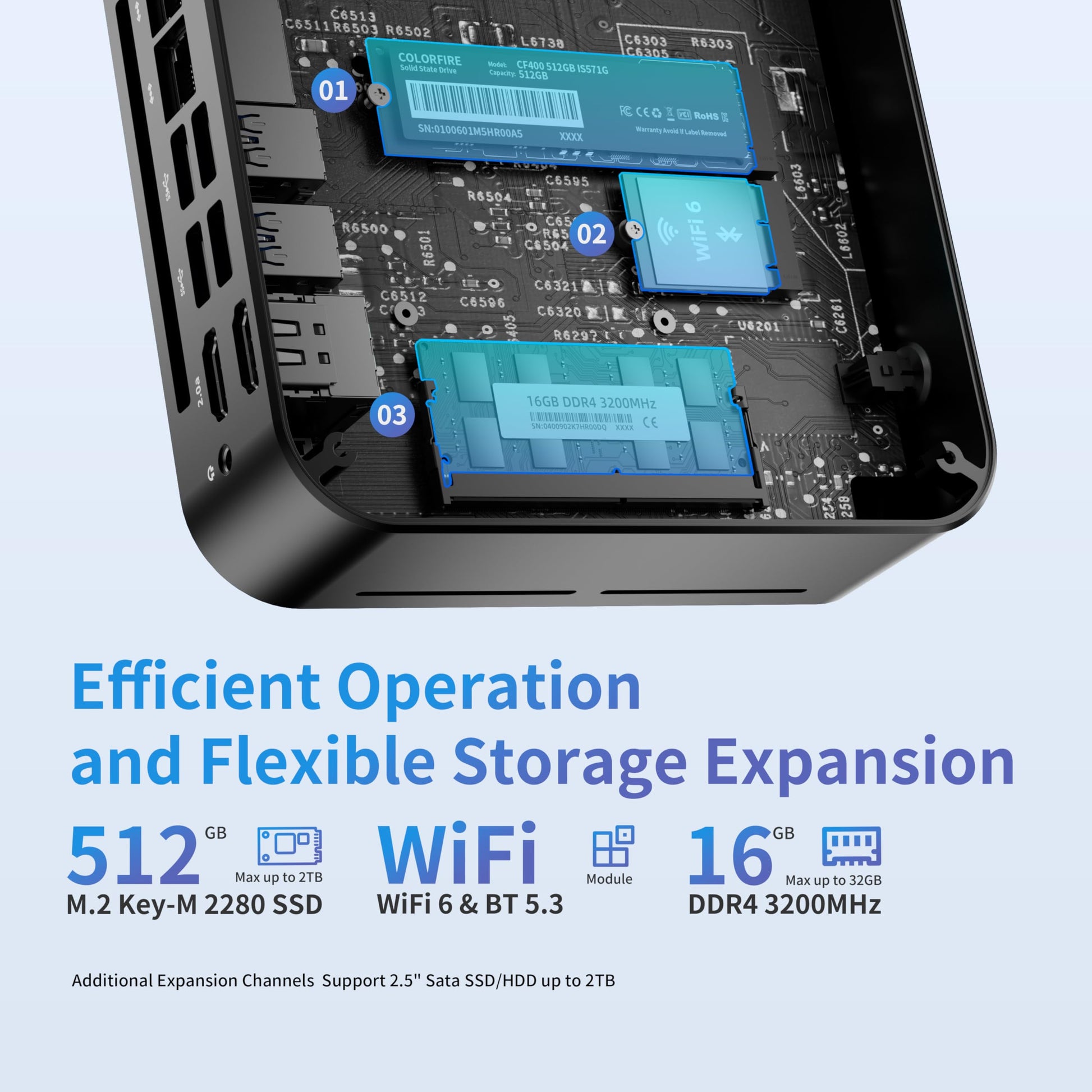 Der Mini-PC bietet maximale Konnektivität. Für schnelle und stabile Drahtlosverbindungen ist er mit modernstem WiFi 6 ausgestattet. Zusätzlich verfügt er über zwei Gigabit-Ethernet-Anschlüsse (RJ45), was ihn ideal für stabile Netzwerkverbindungen im Büro oder als zuverlässigen Heimserver macht.