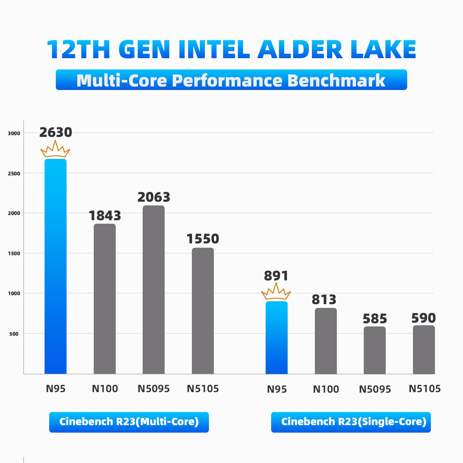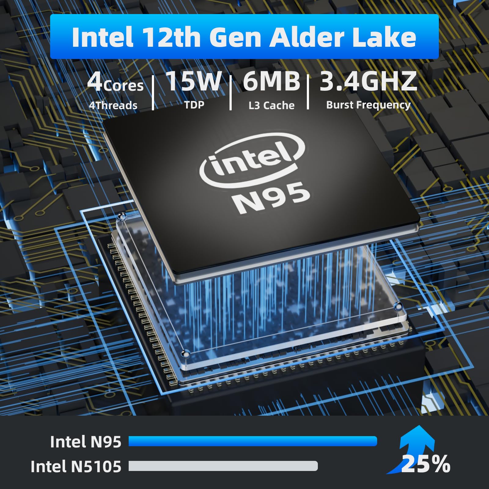 - Leistungsstarker Intel N95 Prozessor: Ausgerüstet mit einem Intel Prozessor der 12. Generation (4 Kerne/4 Threads, bis zu 3.4 GHz), der eine deutlich höhere Leistung als Vorgängermodelle wie der N5105 bietet und dabei äusserst energieeffizient arbeitet.