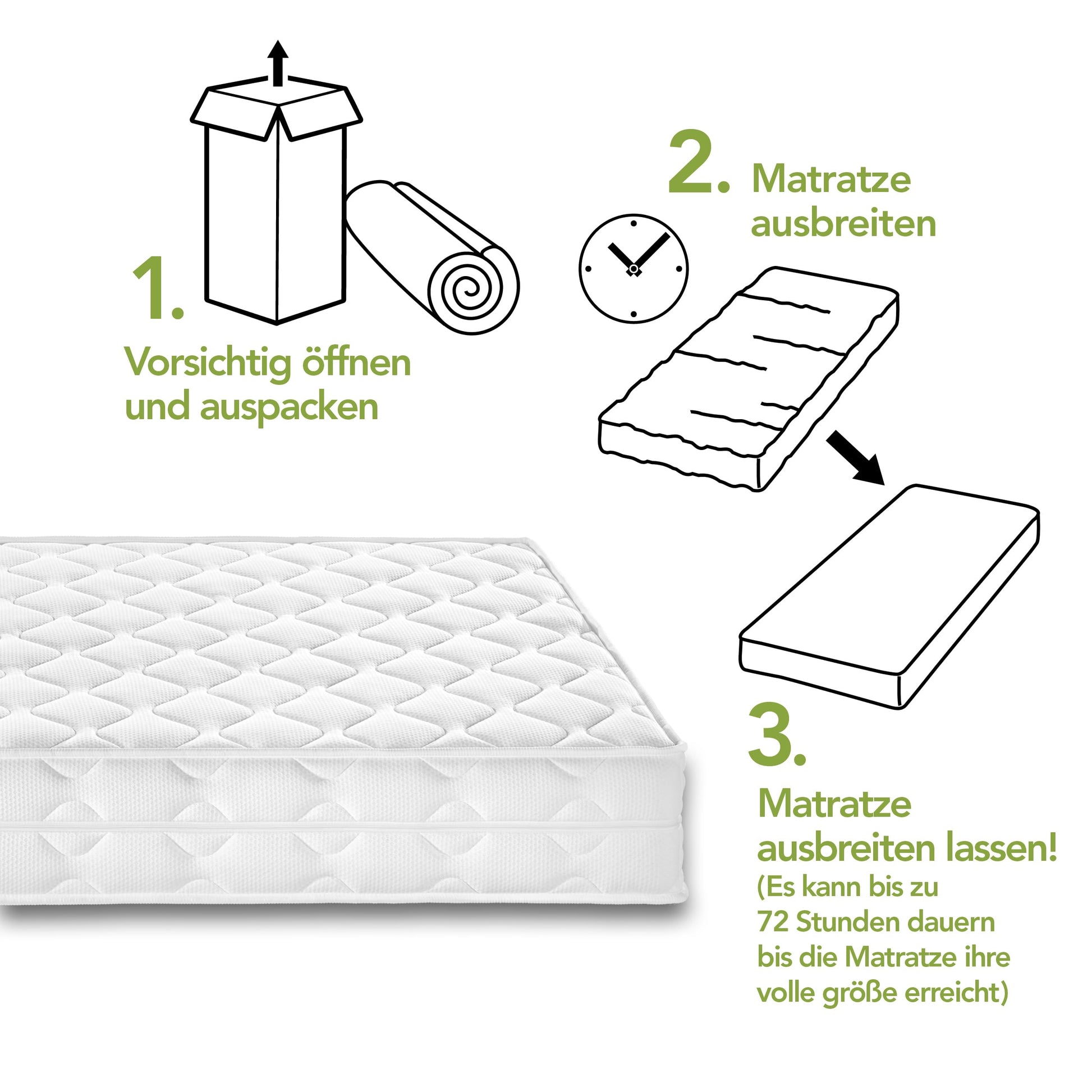 Die Matratze wird platzsparend gerollt und vakuumiert geliefert. Nach dem Auspacken benötigt sie etwa 24 bis 48 Stunden, um sich vollständig zu entfalten und ihre finale Höhe von ca. 22 cm zu erreichen. Danach ist sie sofort einsatzbereit.