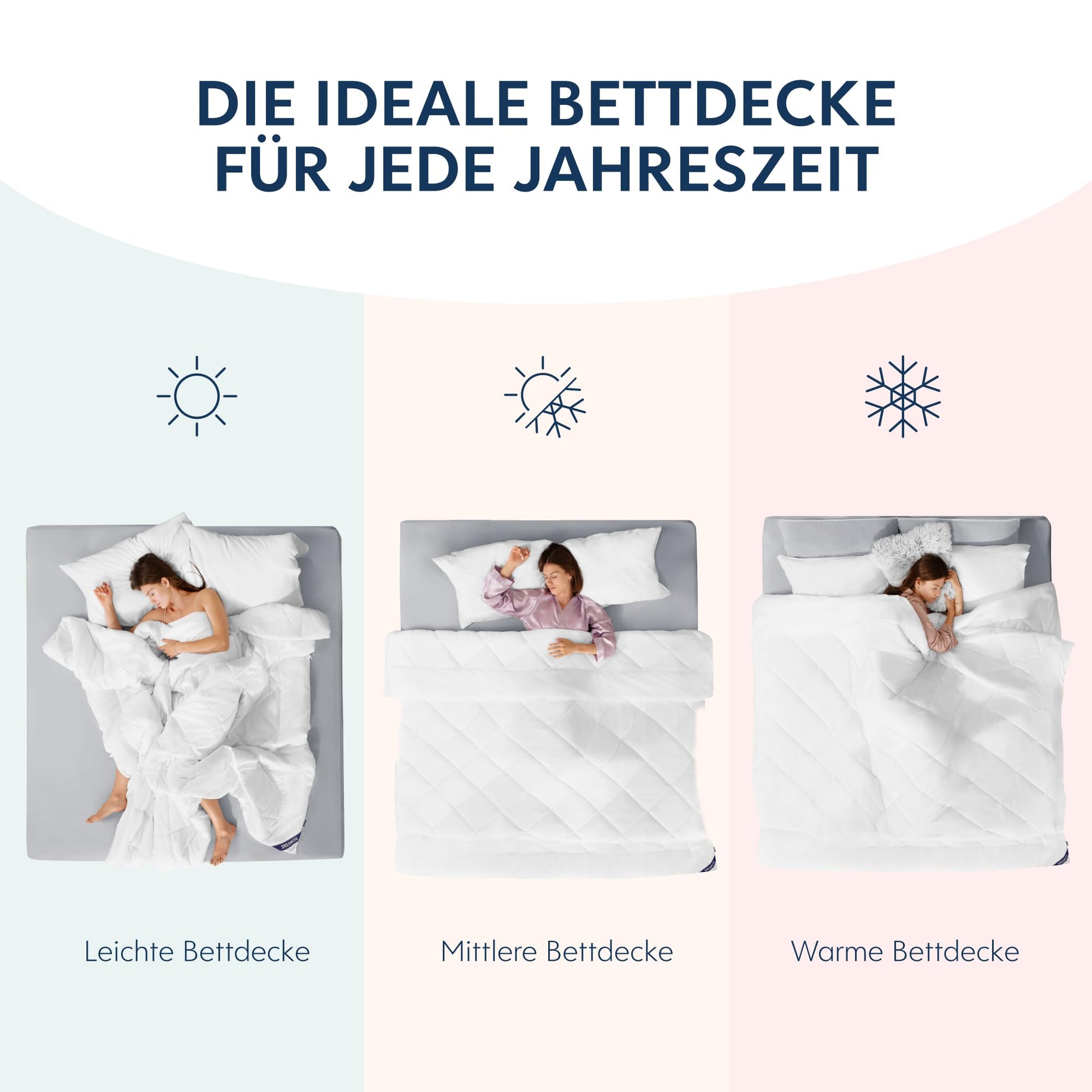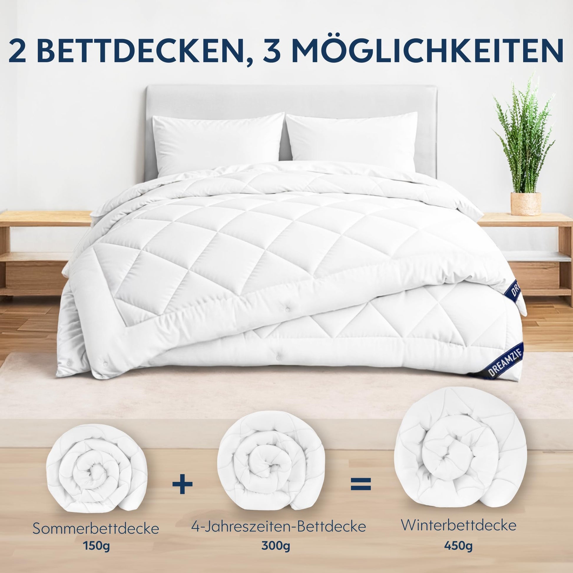 - 3-in-1-System: Eine leichte Sommerdecke (150 g/m²) und eine Ganzjahresdecke (300 g/m²), die zusammen eine extra warme Winterdecke (450 g/m²) ergeben.