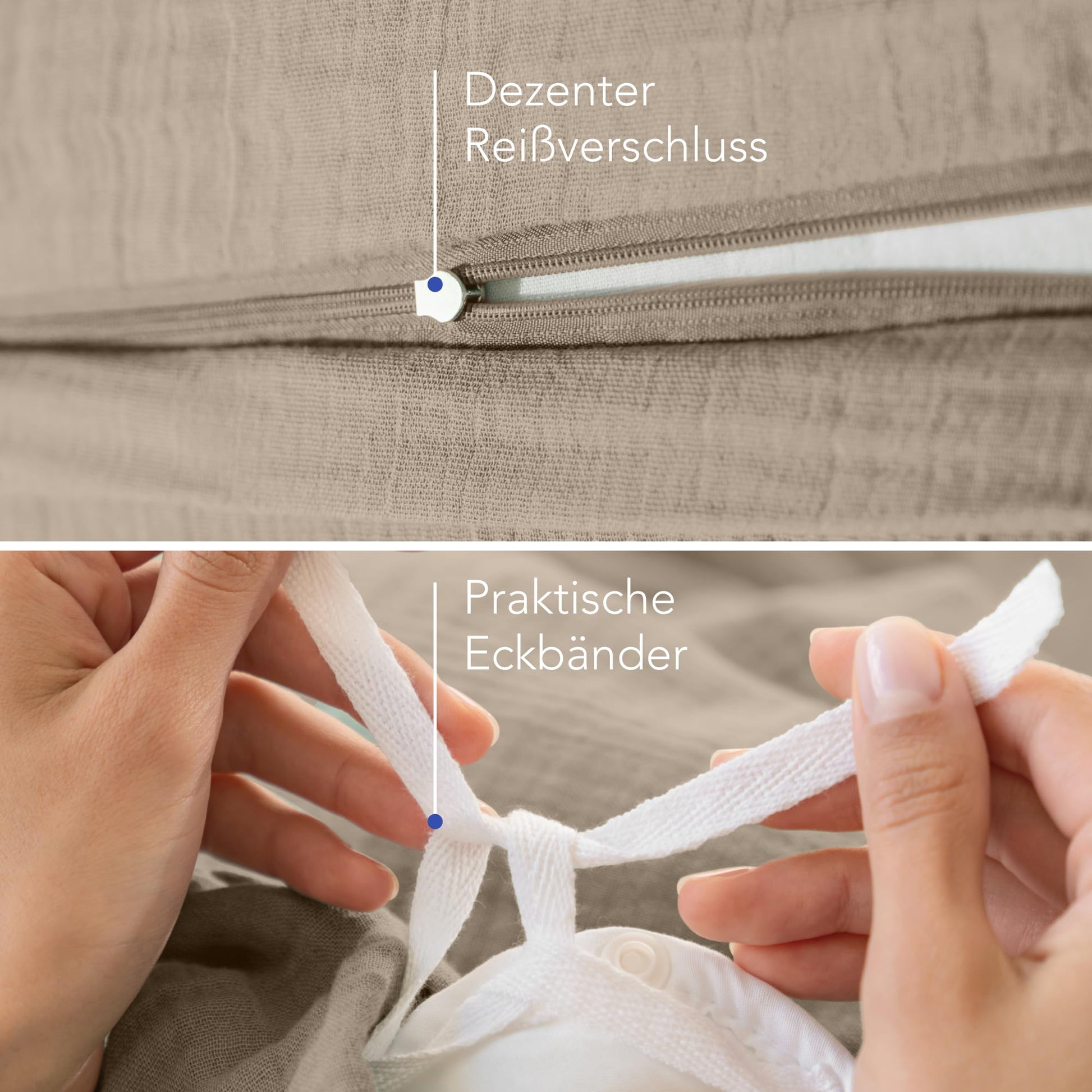 Durchdacht und praktisch: Das Beziehen wird zum Kinderspiel. Die verdeckten Reissverschlüsse sind nicht nur optisch ansprechend, sondern auch funktional. Zudem verhindern die eingenähten Eckbänder im Innern des Bezugs, dass Ihr Duvet nachts verrutscht.