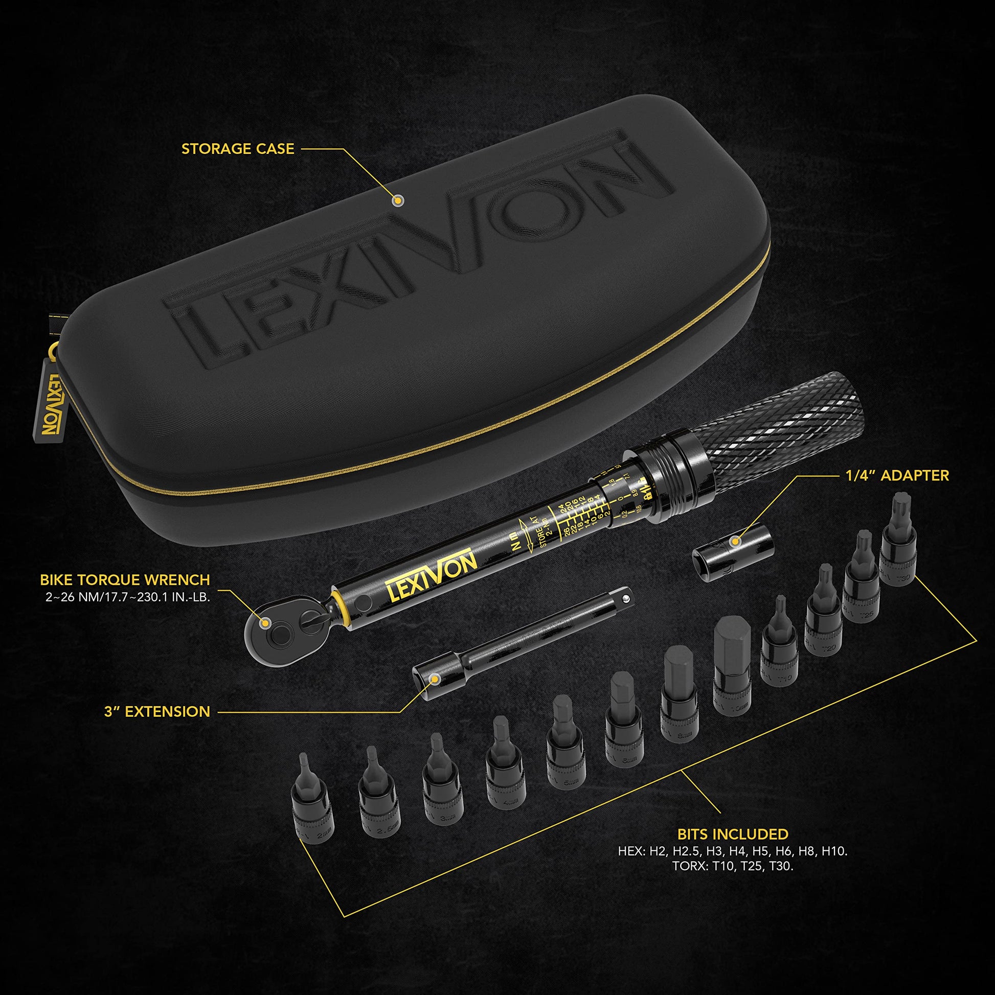 Das Set beinhaltet alles für den sofortigen Einsatz: einen 1/4-Zoll-Drehmomentschlüssel (2-26 Nm), eine Auswahl der gängigsten Bits (Innensechskant: H2, H2.5, H3, H4, H5, H6, H8, H10; Torx: T10, T20, T25, T30), eine 7,6 cm lange Verlängerungsstange sowie einen 1/4-Zoll-Adapter.