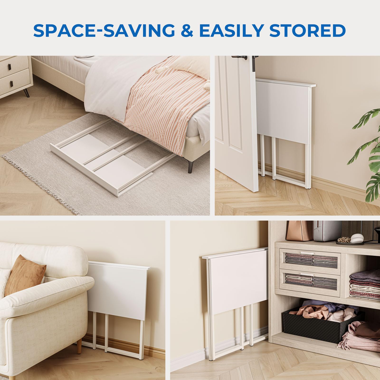 - Kompaktes Design: In nur wenigen Sekunden lässt sich der Tisch flach zusammenklappen. Mit einer Dicke von nur 8 cm passt er mühelos unter das Bett, hinter eine Tür oder in eine Nische.