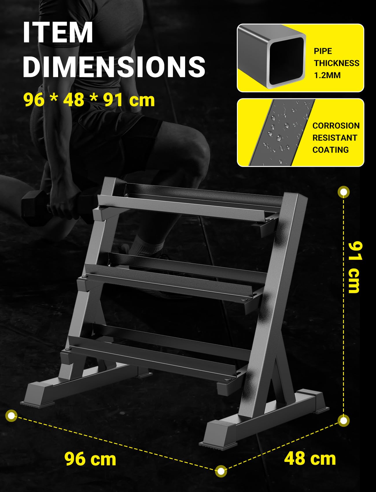 - Universell passend: Die Ablageflächen sind in der Breite von 5 cm bis 13 cm verstellbar. Dadurch eignet sich der Ständer ideal für unterschiedliche Grössen von Kurzhanteln und auch für Kettlebells.