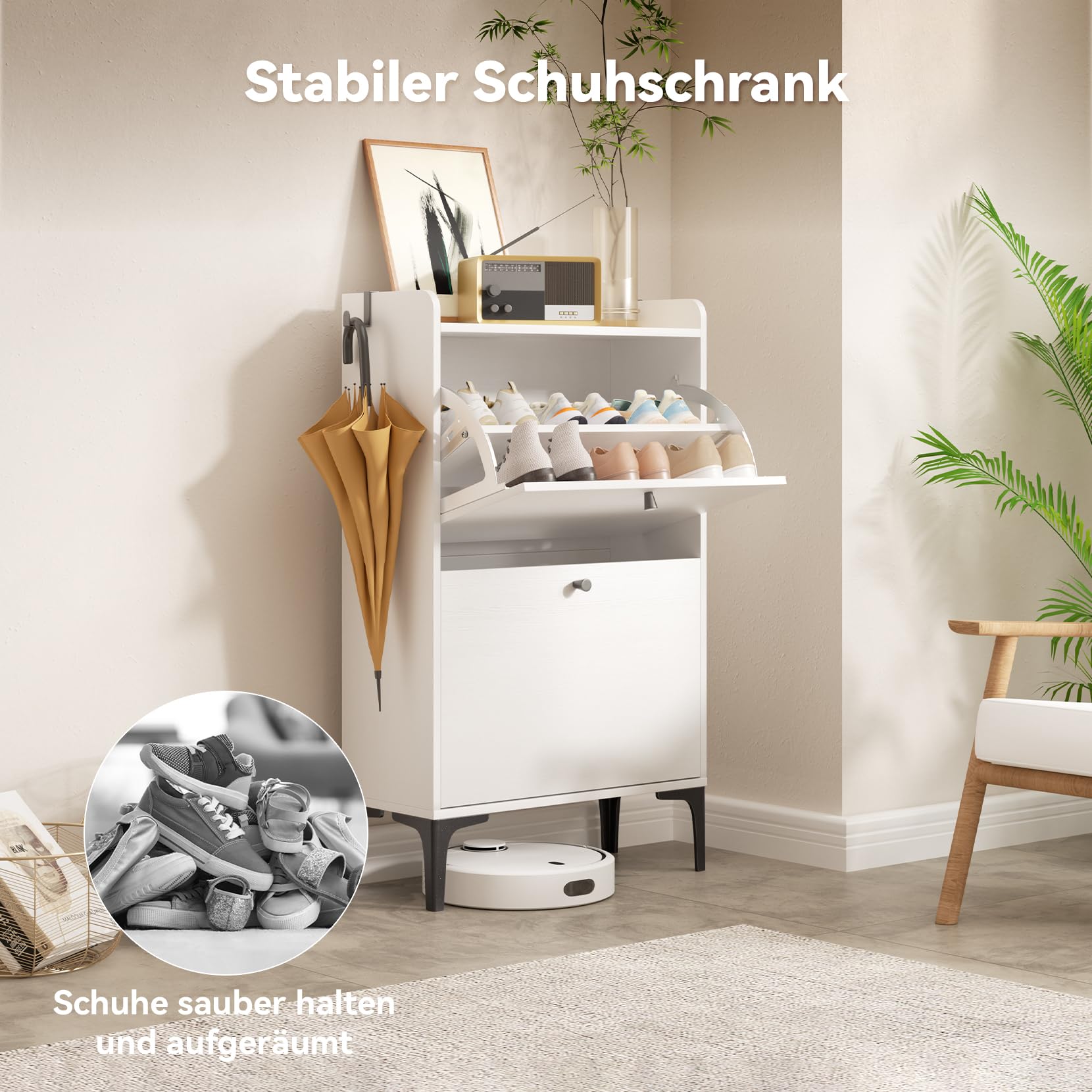 Dieser Schuhschrank ist ein echtes Raumwunder. Seine minimale Tiefe ermöglicht es, auch in engen Platzverhältnissen für maximale Ordnung zu sorgen. Die geschlossenen Kipp-Schubladen schützen Ihre Schuhe zuverlässig vor Staub und halten sie gleichzeitig für Haustiere unerreichbar – eine saubere und ästhetische Alternative zu offenen Regalen.