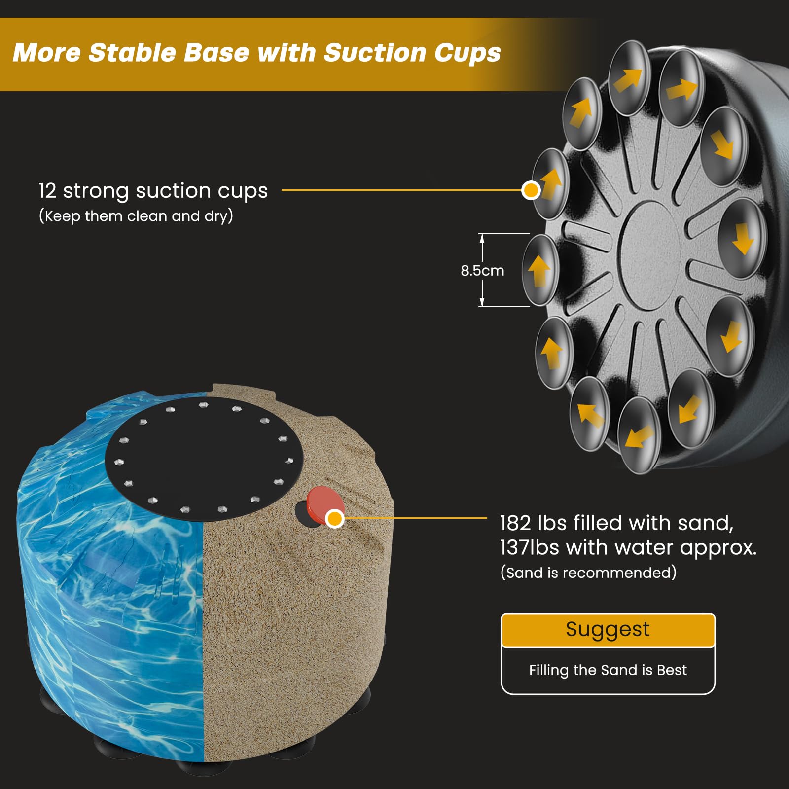 Der Standfuss wird für maximale Stabilität und einen festen Stand mit Wasser oder Sand befüllt. Das Dripex-Modell verfügt zudem über starke Saugnäpfe am Boden, die auf glatten Oberflächen ein Verrutschen oder Umkippen auch bei intensiven Schlägen und Tritten verhindern.