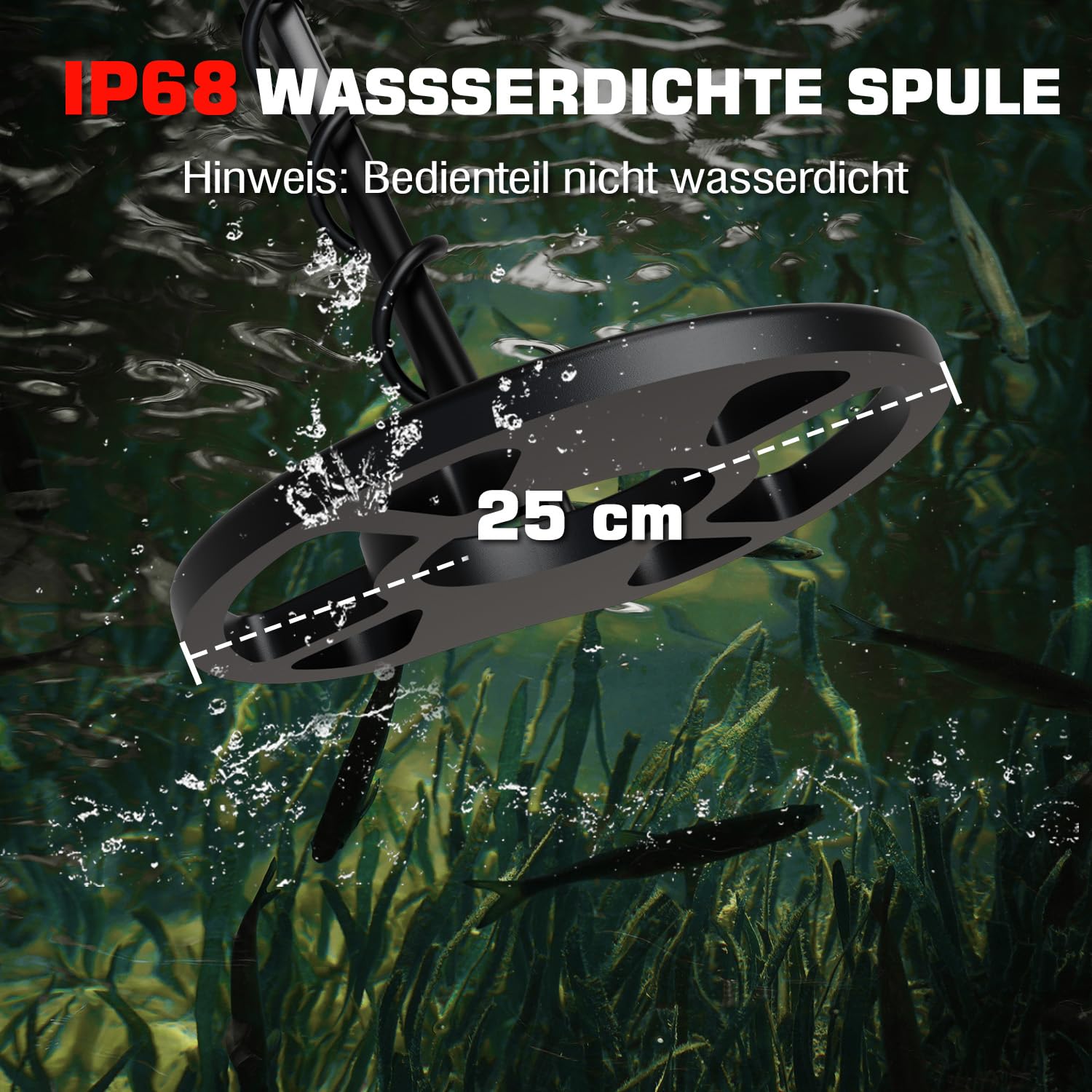 - Wasserdichte IP68-Suchspule: Die hochempfindliche 25-cm-Spule ist komplett wasserdicht und eignet sich perfekt für die Suche an Stränden oder in seichtem Wasser.