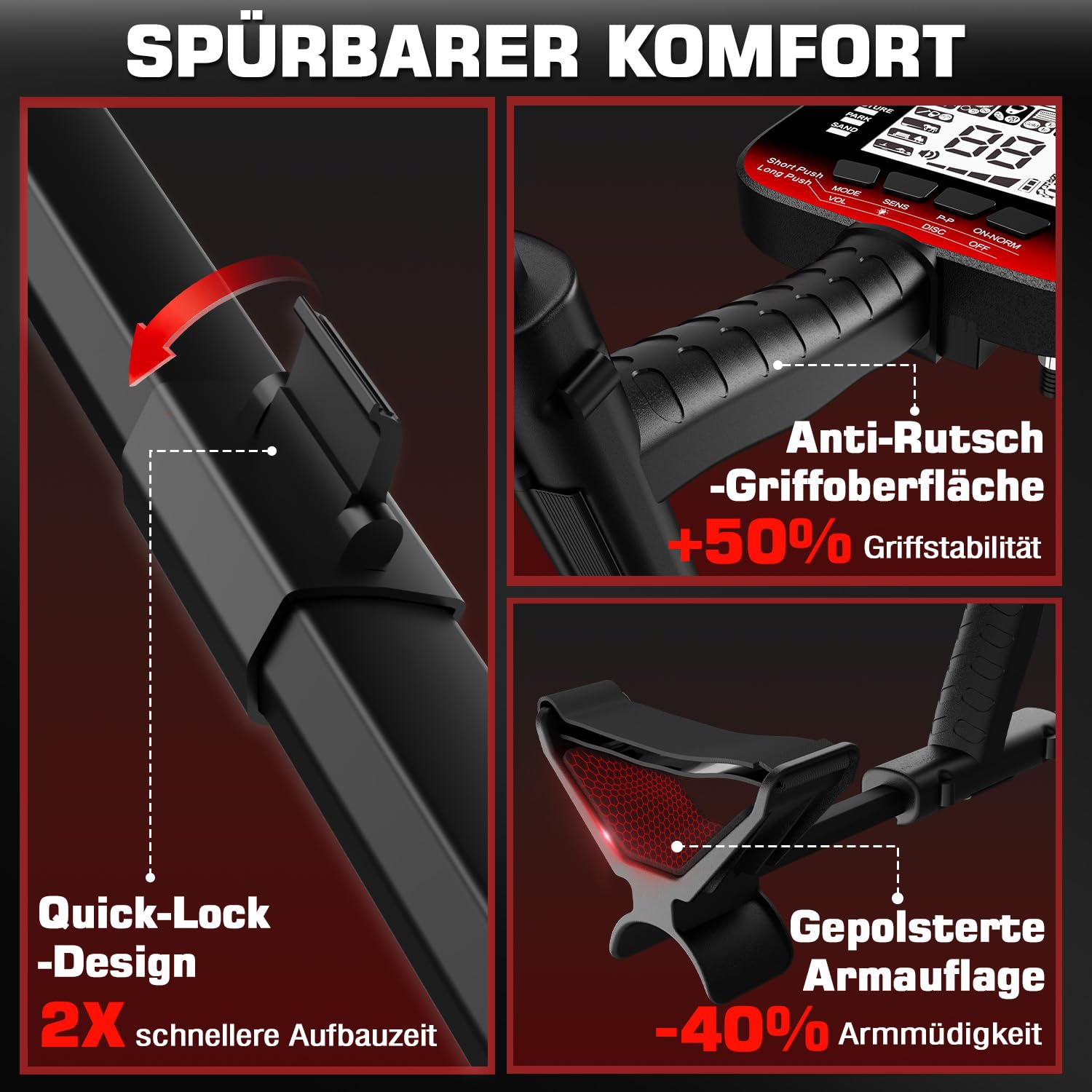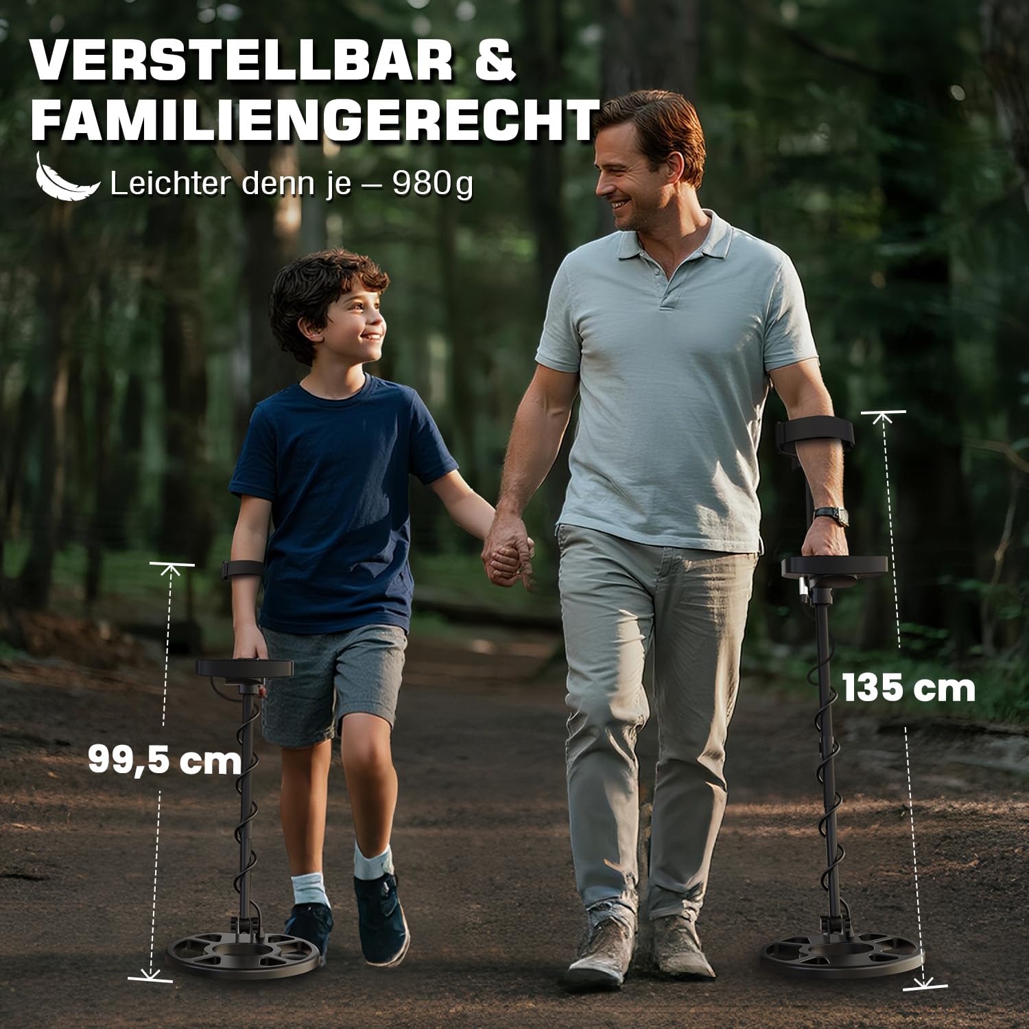 - Leichtbauweise und Ergonomie: Mit einem Gewicht von unter einem Kilogramm und einer verstellbaren Teleskopstange (99.5 cm bis 135 cm) ermöglicht der Detektor stundenlange Suchen ohne Ermüdung.