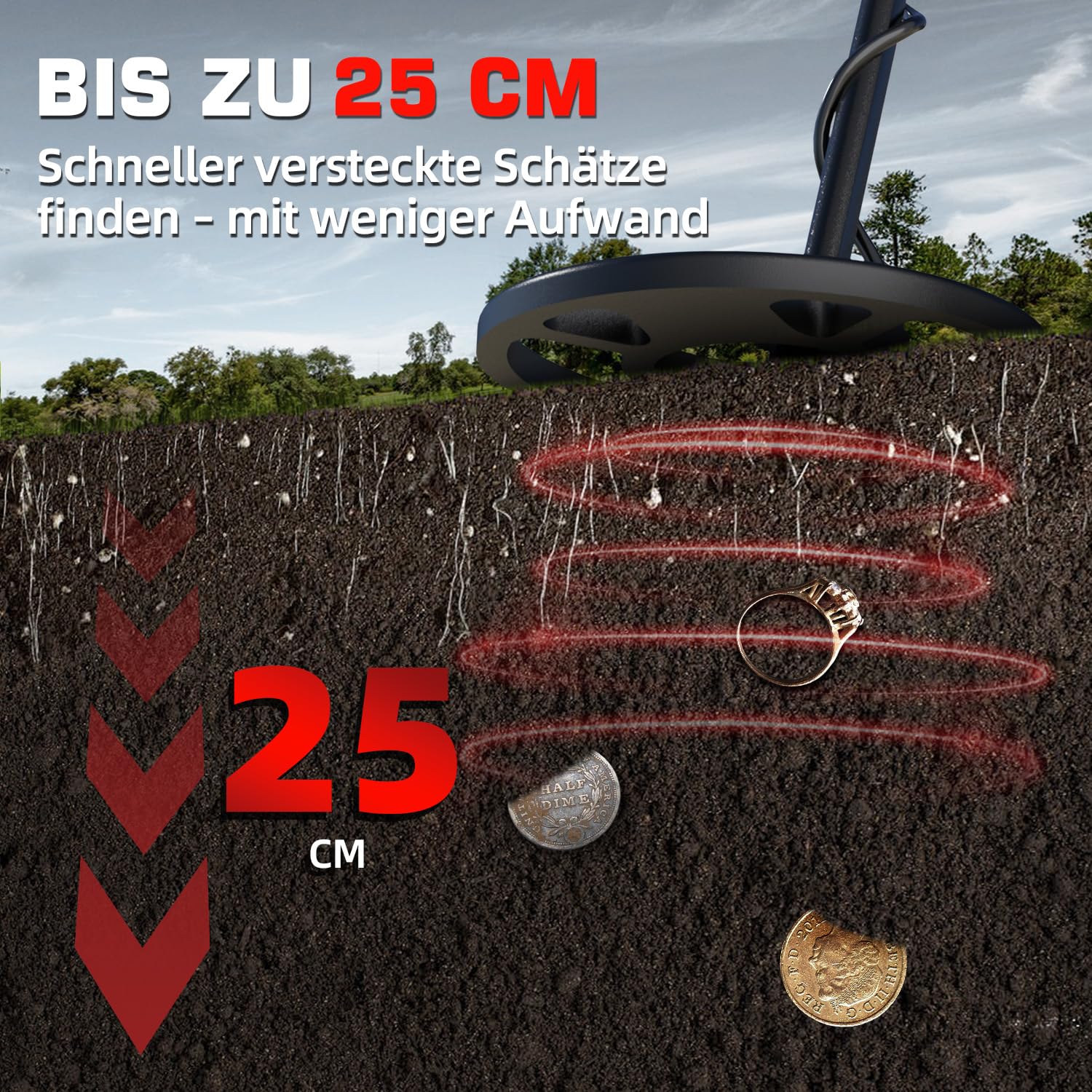 Die Suchtiefe hängt von der Grösse des Objekts und der Bodenbeschaffenheit ab. Münzgrosse Objekte können in der Regel bis zu einer Tiefe von ca. 25 cm geortet werden. Dank des modernen DSP-Chips und des Pinpoint-Modus bietet der Detektor eine hohe Erkennungsgenauigkeit und hilft, Funde exakt zu lokalisieren.
