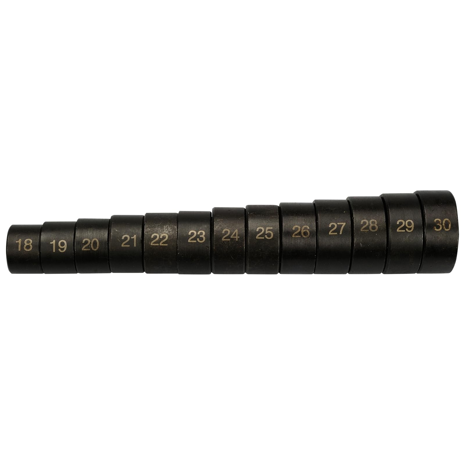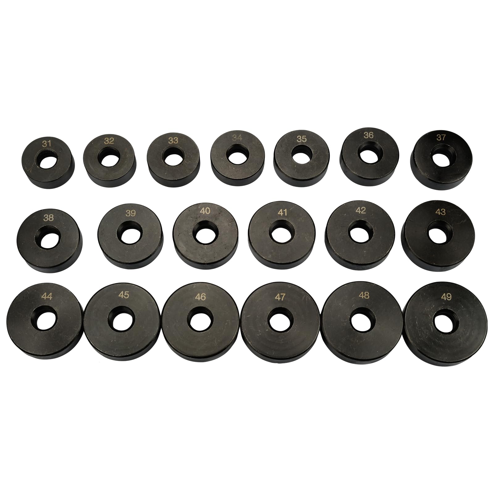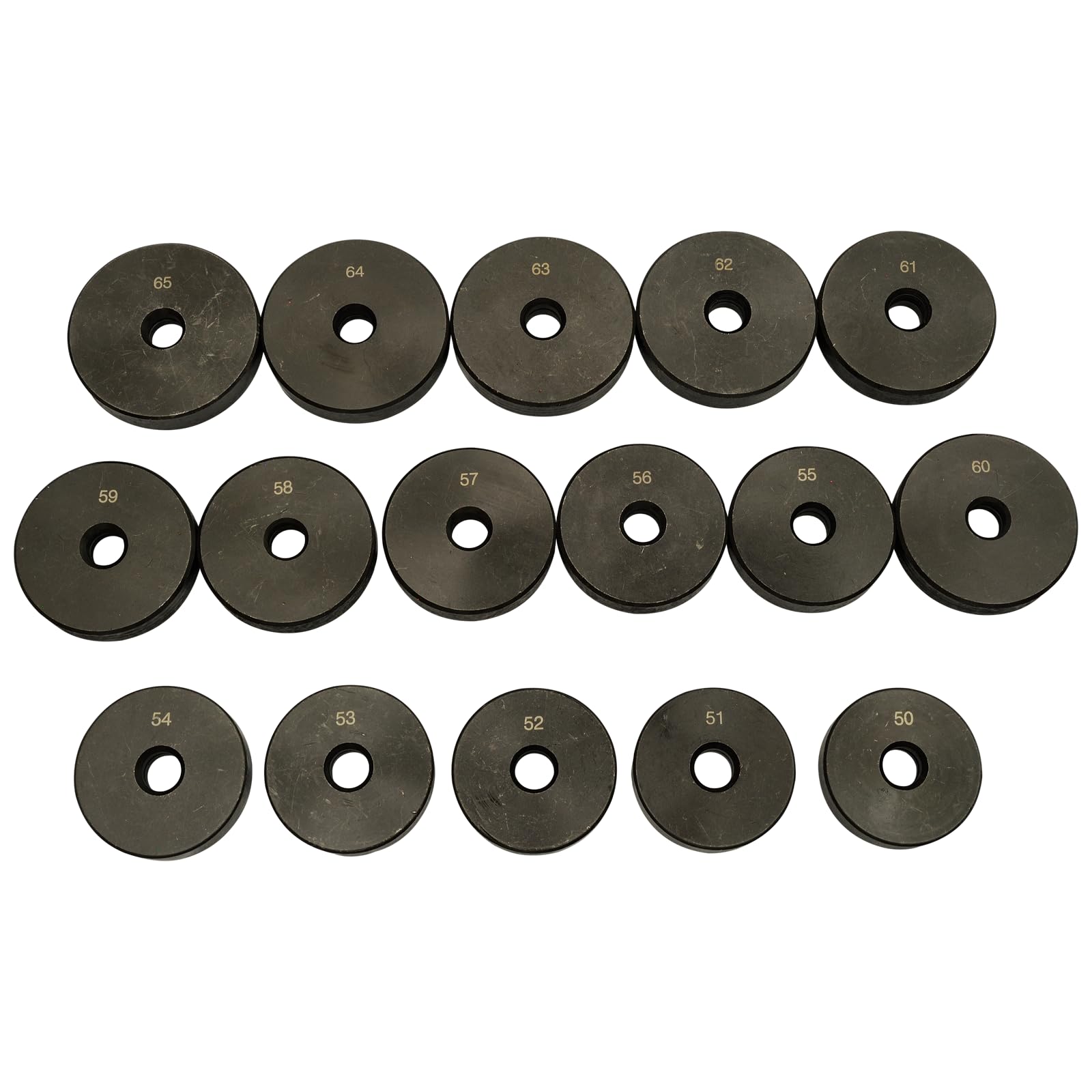 Das Set enthält 48 Druckplatten mit Aussendurchmessern von 18 mm bis 65 mm. Jede Platte ist 12,4 mm hoch und hat eine 12,2 mm Bohrung. Zusätzlich sind ein Aufnahmeteller, ein 220 mm Handgriff, ein Hammer-Adapter und ein 3 mm Innensechskantschlüssel im Lieferumfang.