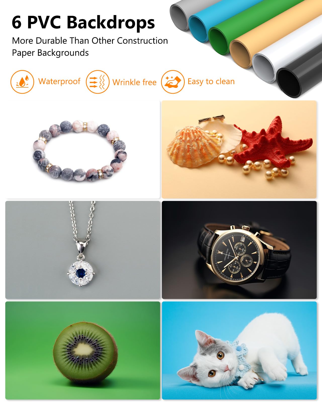 - Vielfältige Hintergründe: Sechs knitterfreie und wasserfeste PVC-Hintergründe in den Farben Weiss, Schwarz, Grau, Hellorange, Blau und Grün sind im Lieferumfang enthalten.