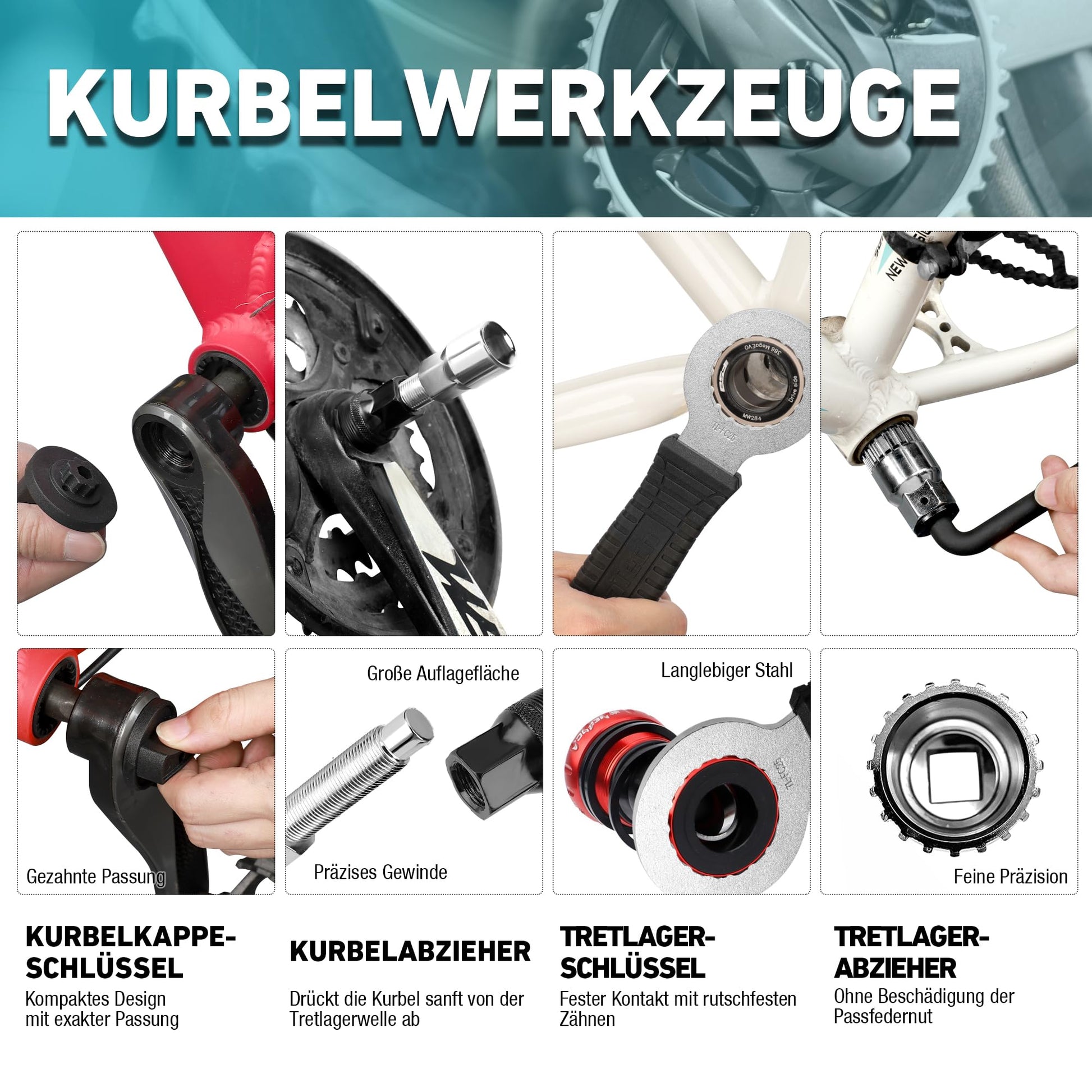 Egal, ob Sie ein Einsteiger oder ein erfahrener Velomechaniker sind, dieses Set deckt Ihre Bedürfnisse ab. Es eignet sich perfekt für vielfältige Aufgaben wie das Wechseln der Kette, die Demontage von Pedalen, das Entfernen der Kassette oder das Flicken eines Pneus.