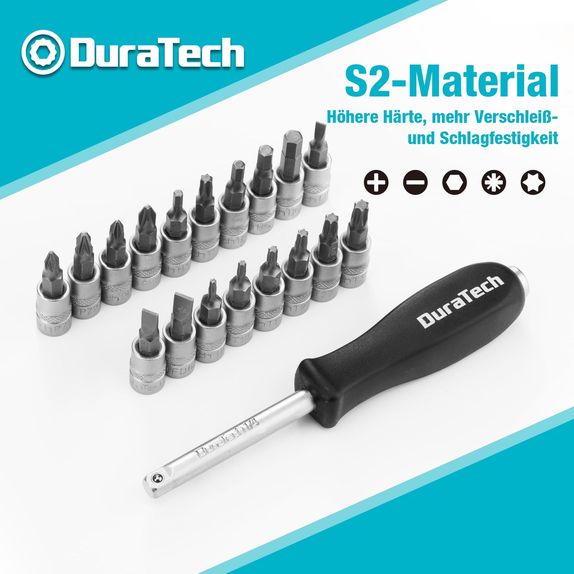 Dank der Verwendung von erstklassigem Chrom-Vanadium- und S2-Stahl ist dieses Set äusserst robust und auf eine lange Lebensdauer ausgelegt. Die matte Verchromung bietet zudem einen effektiven Korrosionsschutz, sodass Ihr Werkzeug auch bei häufigem Einsatz in bestem Zustand bleibt.