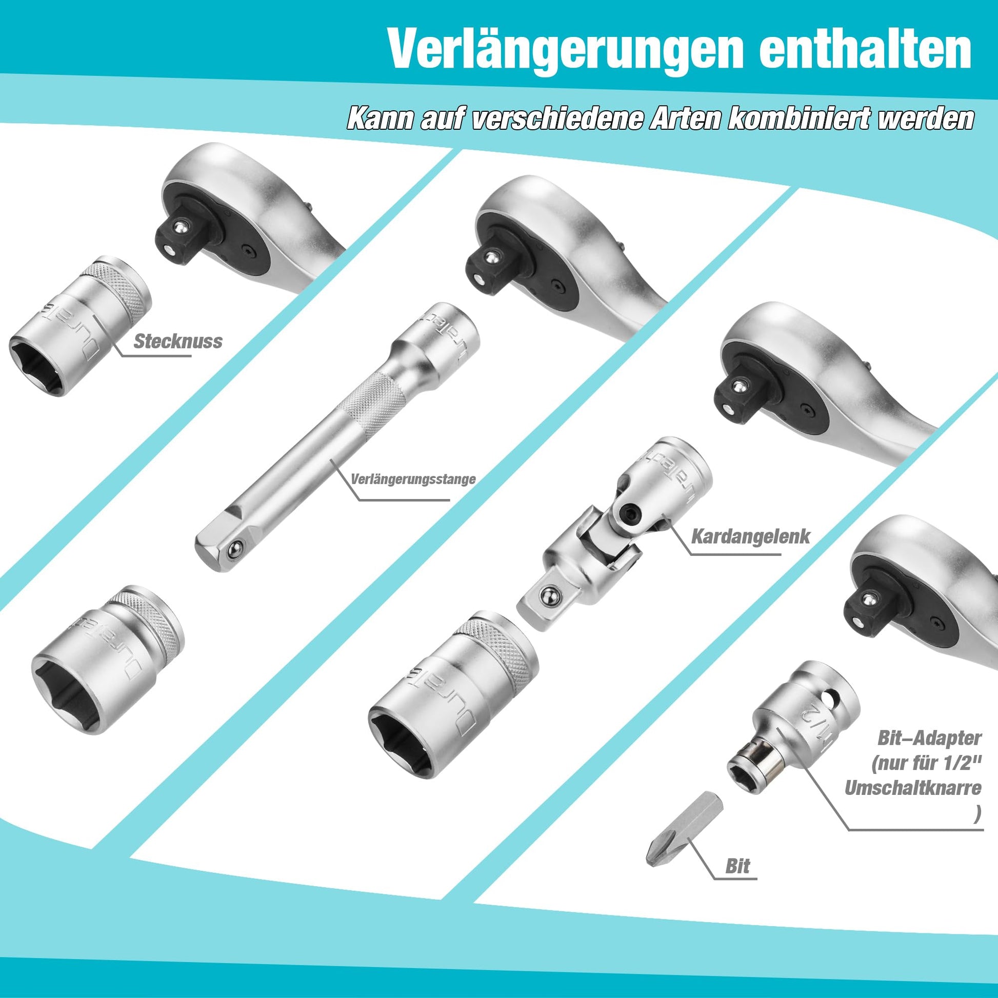 - Komplettausstattung: Das 108-teilige Set umfasst 1/2” und 1/4” Umschaltknarren, eine Vielzahl an Stecknüssen in gängigen Grössen, diverse Bits, Kardangelenke sowie Verlängerungsstangen.