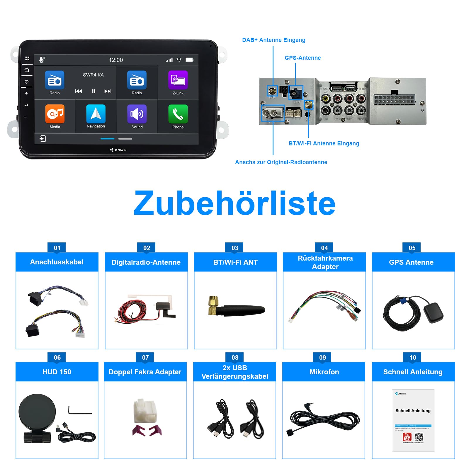 - Lieferumfang: Hauptgerät, Head-up-Display, DAB+ Antenne, GPS Antenne, Anschlusskabel, digitales Doppel-Mikrofon.
