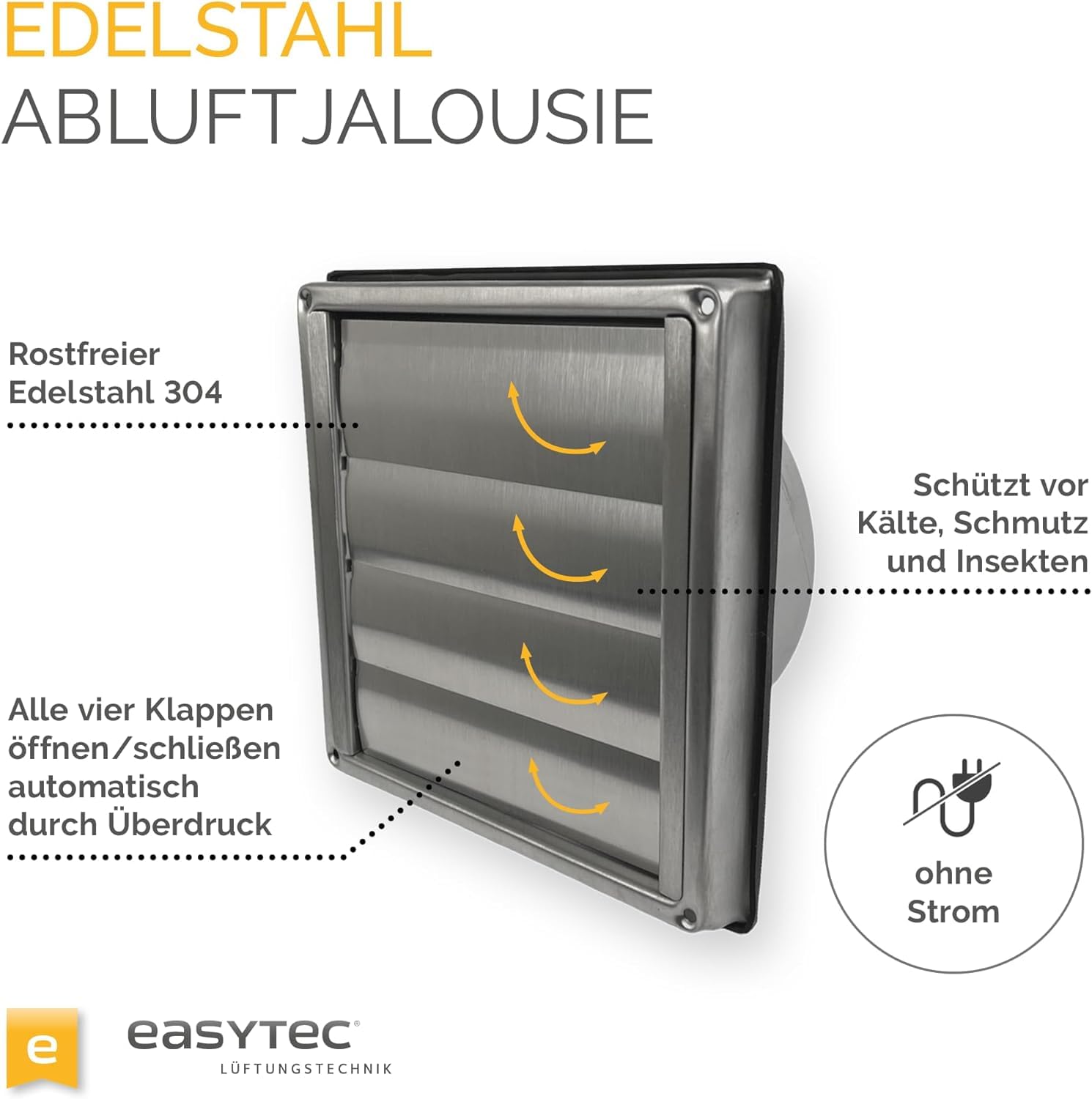 Dieser Standard-Mauerkasten von easytec ist eine zuverlässige und preisbewusste Lösung für die Abluftführung Ihrer Dunstabzugshaube. Er kombiniert eine hochwertige Aussenjalousie aus Edelstahl mit einem cleveren, doppelten Rückstauklappen-System für eine optimale Energieeffizienz und Leistung.