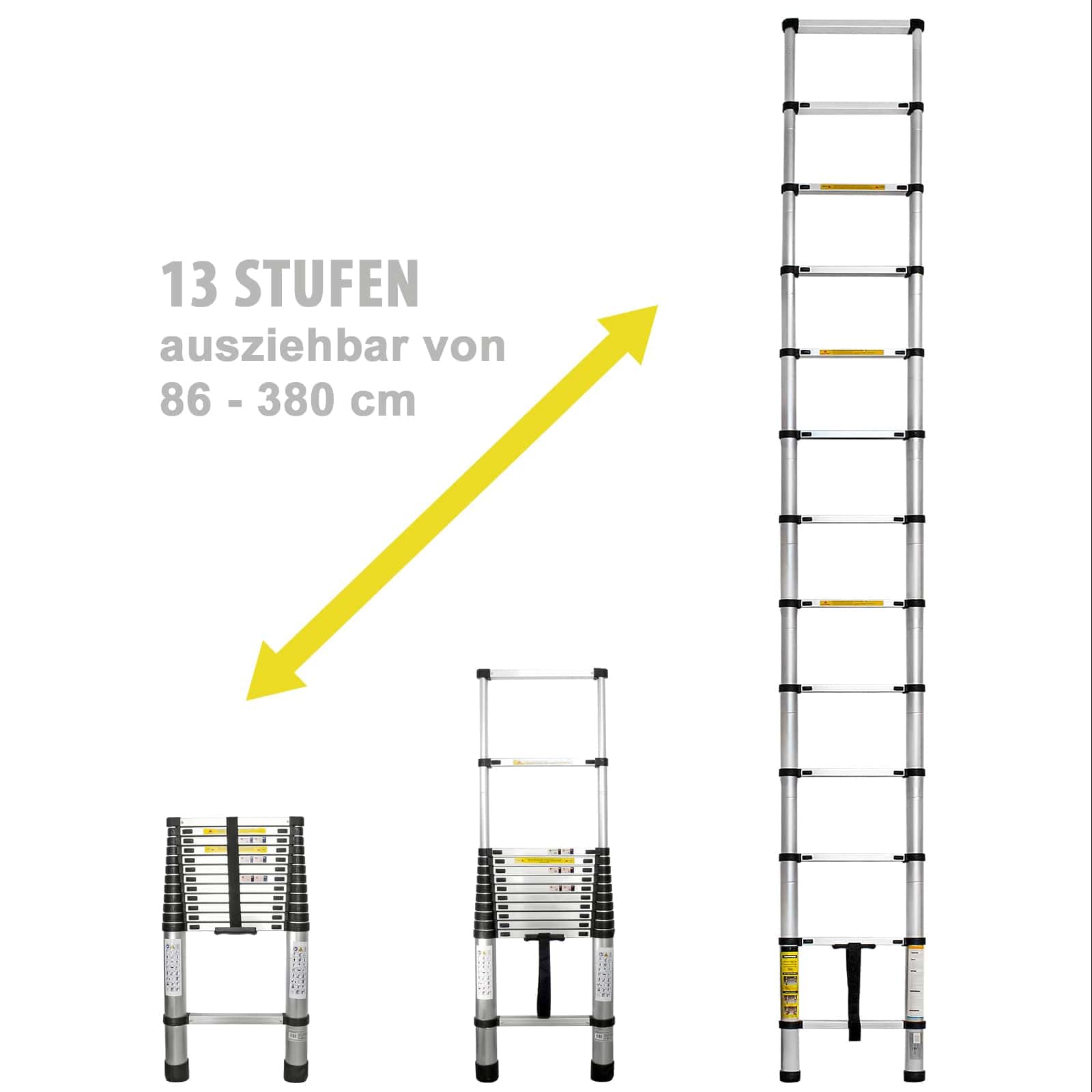 Eaxus Teleskopleiter 3.8m Mehrzweckleiter Alu 13 Stufen Silber