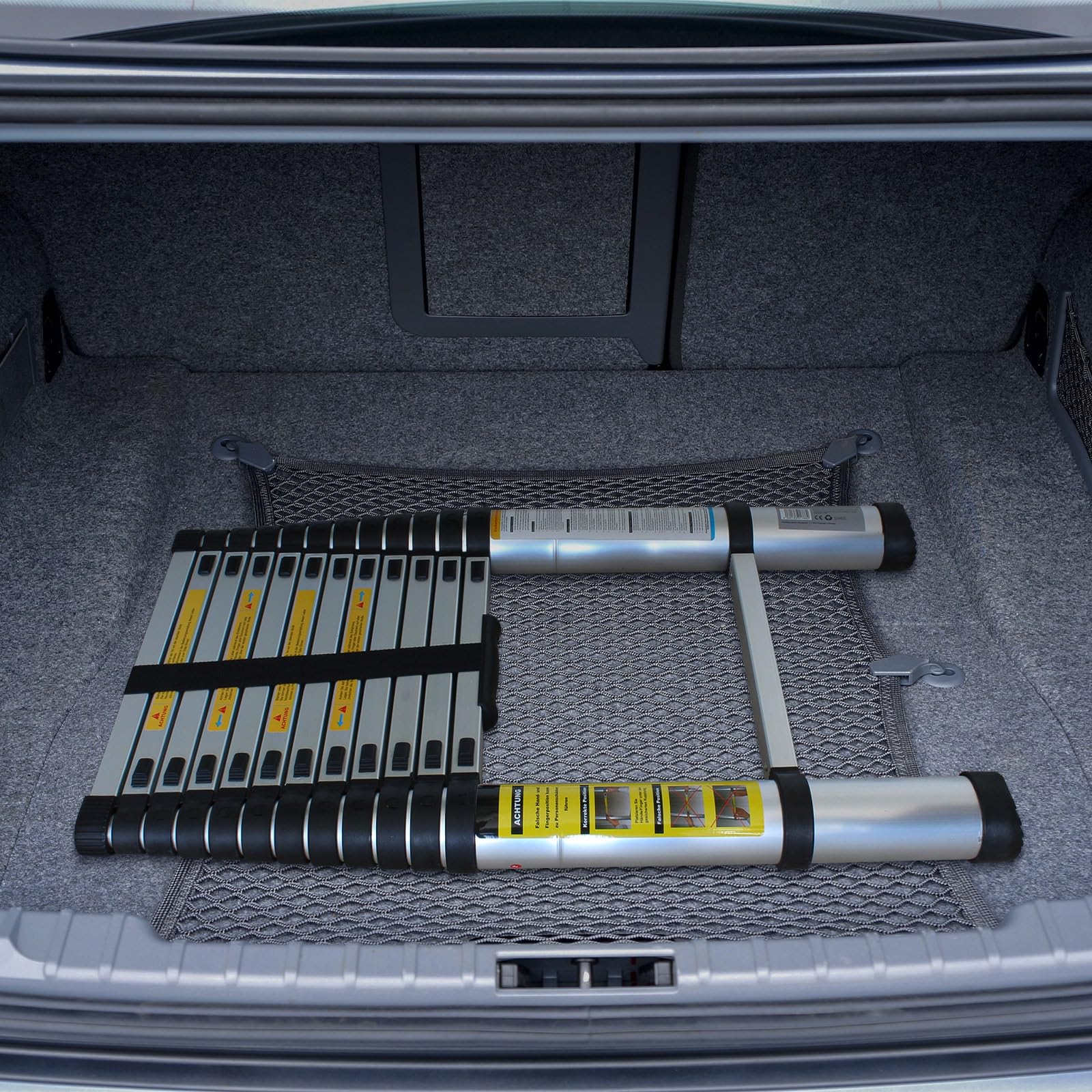 Nach Gebrauch lässt sich die Leiter auf ein äusserst kompaktes Mass von nur 47 cm x 8 cm x 86 cm zusammenschieben. Dadurch passt sie problemlos in fast jeden Kofferraum und kann platzsparend in Garagen oder Abstellkammern gelagert werden.