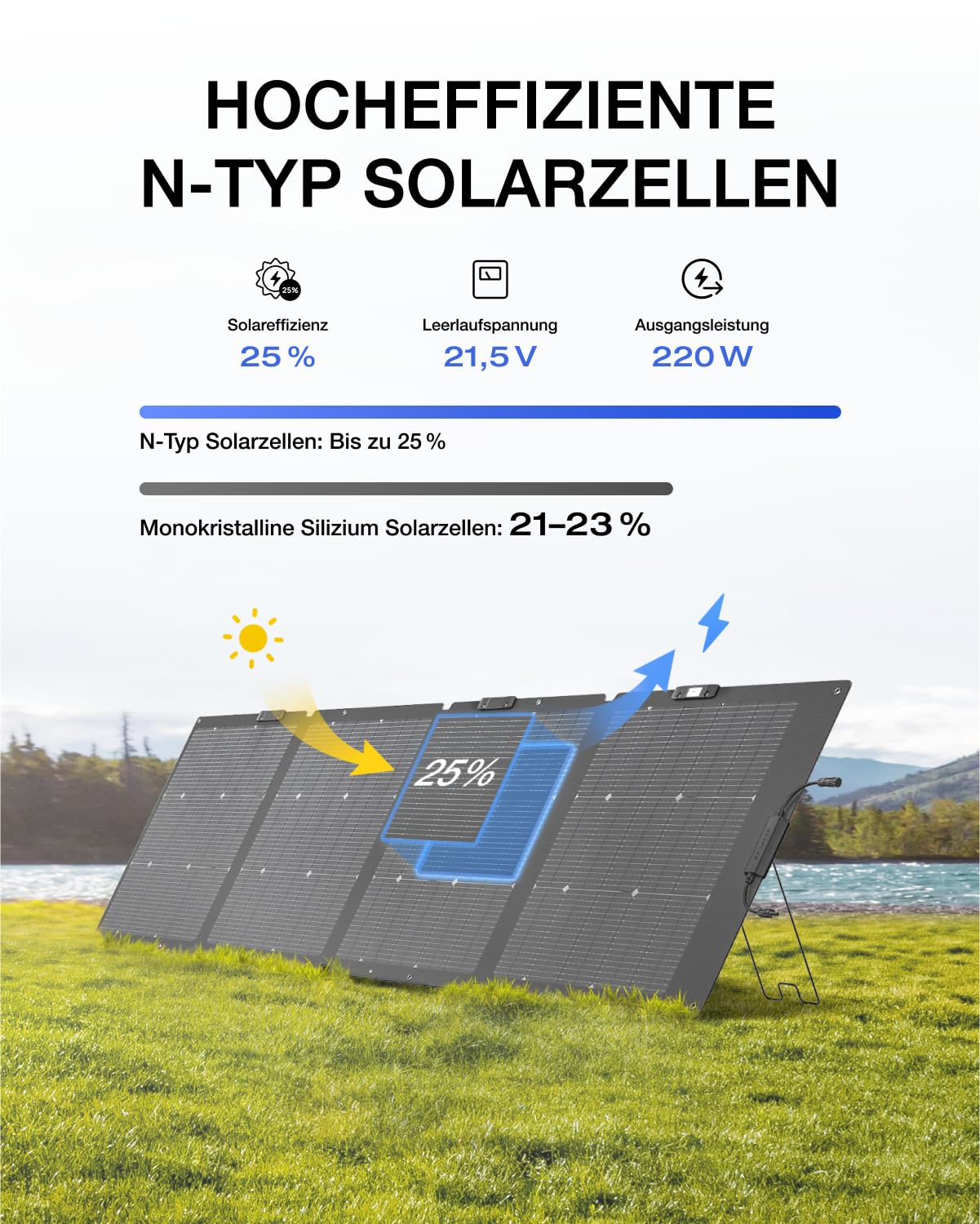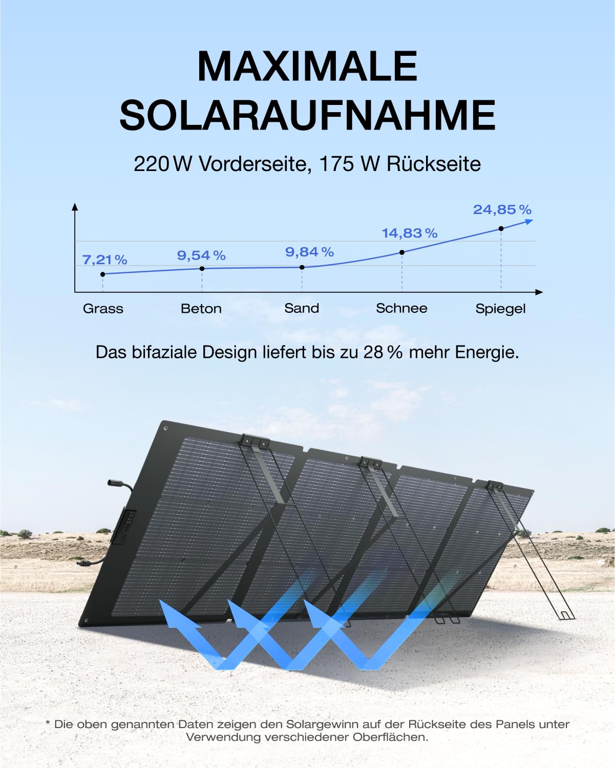 Der Hauptvorteil ist die beidseitige Energieaufnahme. Die Vorderseite erfasst bis zu 220 W direktes Sonnenlicht, während die Rückseite bis zu 155 W Umgebungslicht aufnimmt. Dadurch erzeugen Sie bis zu 28 % mehr Energie und laden Ihre Powerstation erheblich schneller auf.