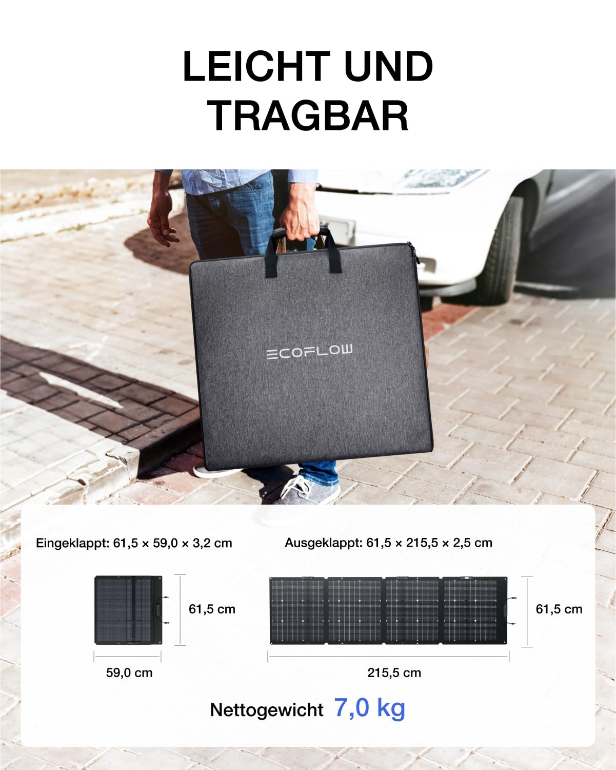 - Kompakt und tragbar: Mit einem Gewicht von nur 7 kg und seinem faltbaren Design lässt sich das Solarmodul leicht transportieren und in Sekundenschnelle aufbauen – ideal für Wohnwagen, Garten oder Balkon.