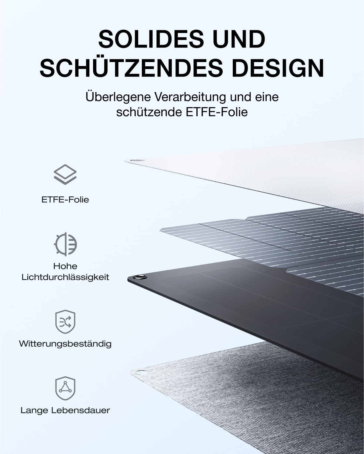 - Wetterfest und langlebig: Dank der IP68-Zertifizierung ist das Panel vollständig gegen Wasser und Staub geschützt. Die robuste ETFE-Beschichtung gewährleistet eine hohe Lichtdurchlässigkeit und eine lange Lebensdauer.