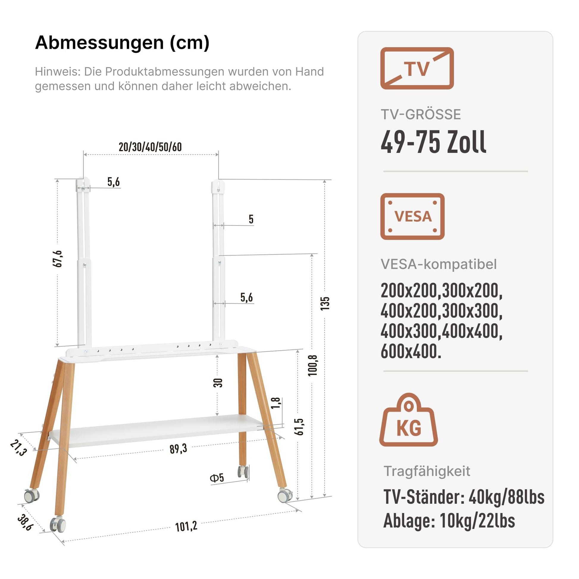 Der Ständer ist universell für die meisten TV-Geräte von 49 bis 75 Zoll mit einem maximalen Gewicht von 40 kg konzipiert. Dank Kompatibilität mit gängigen VESA-Befestigungsmustern passt er für eine Vielzahl von Marken und Modellen.