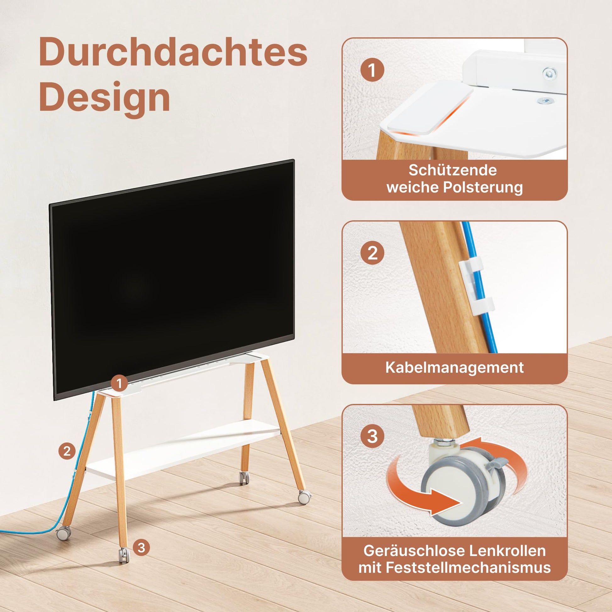 Dank der leichtgängigen Rollen bewegen Sie Ihren Fernseher mühelos dorthin, wo Sie ihn gerade benötigen – ideal für flexible Präsentationen im Büro, den Unterricht im Schulzimmer oder den Filmabend im Wohnzimmer. Das minimalistische Design ist nicht nur platzsparend, sondern wertet Ihre Einrichtung als stilvolles Deko-Objekt auf, anstatt sie zu dominieren.