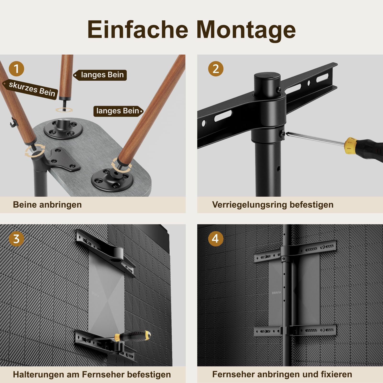 Der Ständer kombiniert hochwertiges Metall mit drei Standbeinen aus edlem, FSC-zertifiziertem Walnussholz. Das minimalistische Staffelei-Design ist von Kunstausstellungen inspiriert und verwandelt Ihren Fernseher in ein stilvolles Designobjekt, das sich elegant in Ihr Wohnzimmer einfügt.