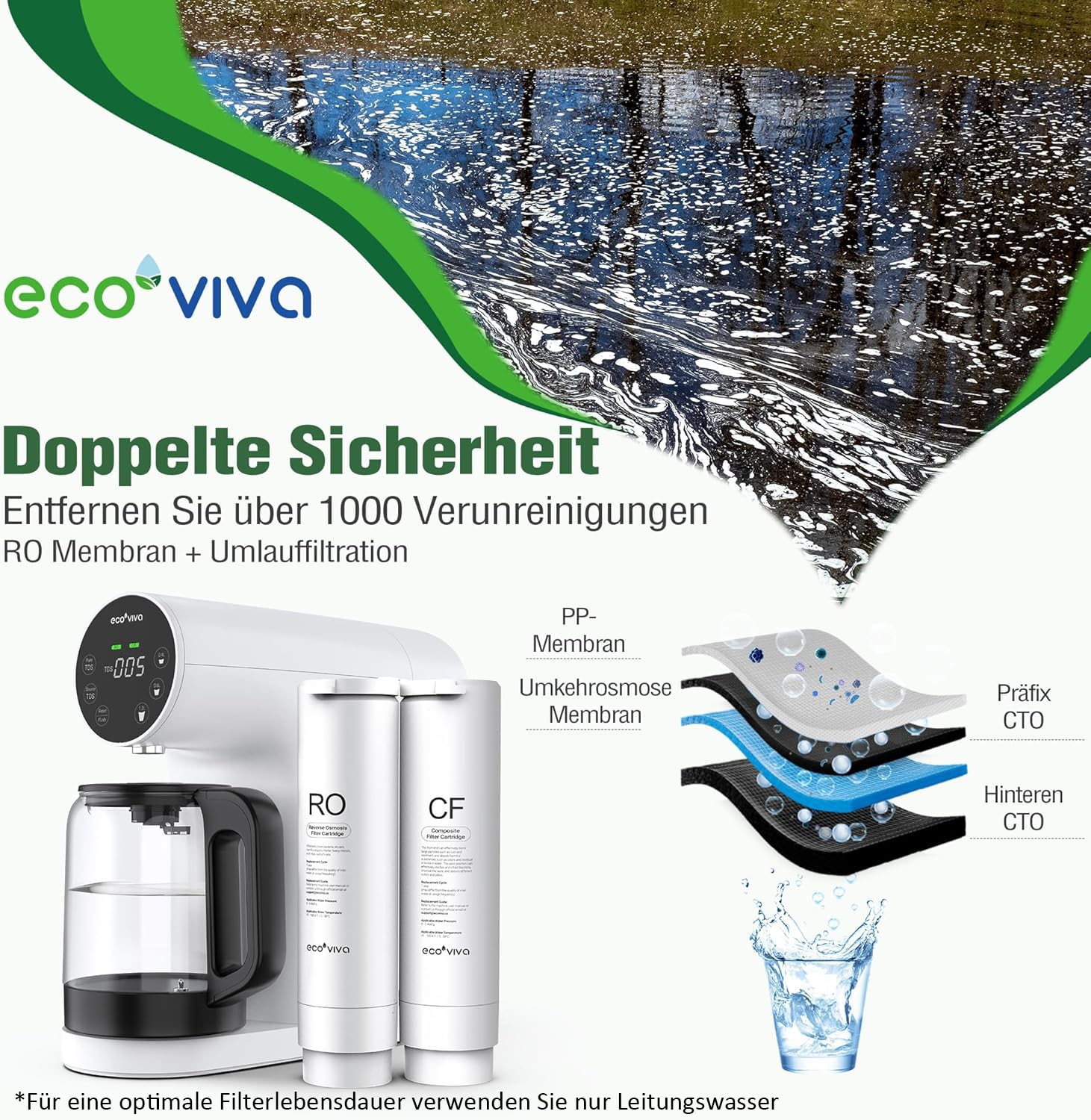 Die Ecoviva Auftisch-Osmoseanlage verwandelt Ihr Leitungswasser in reinstes Trinkwasser. Geniessen Sie dank fortschrittlicher Filtration und unkomplizierter Bedienung jederzeit höchste Wasserqualität direkt bei Ihnen zu Hause oder im Büro.