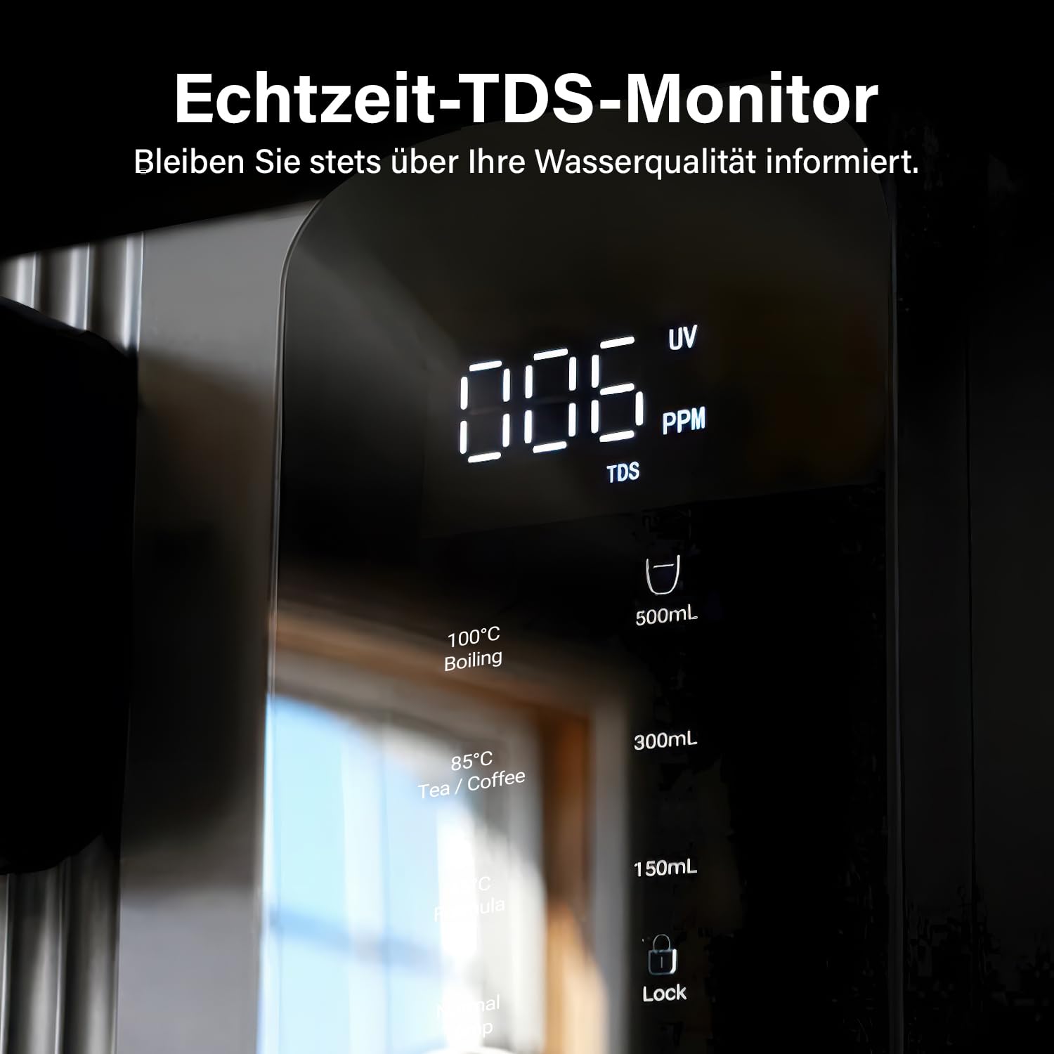 Die Anlage verfügt über eine innovative 3-Sekunden-Heiztechnologie. Sie können per Knopfdruck zwischen vier Temperaturstufen wählen: normale Raumtemperatur, 45 °C (ideal für Babynahrung), 85 °C (perfekt für grünen Tee) und 100 °C (kochend heiss für Tee oder Instant-Gerichte).