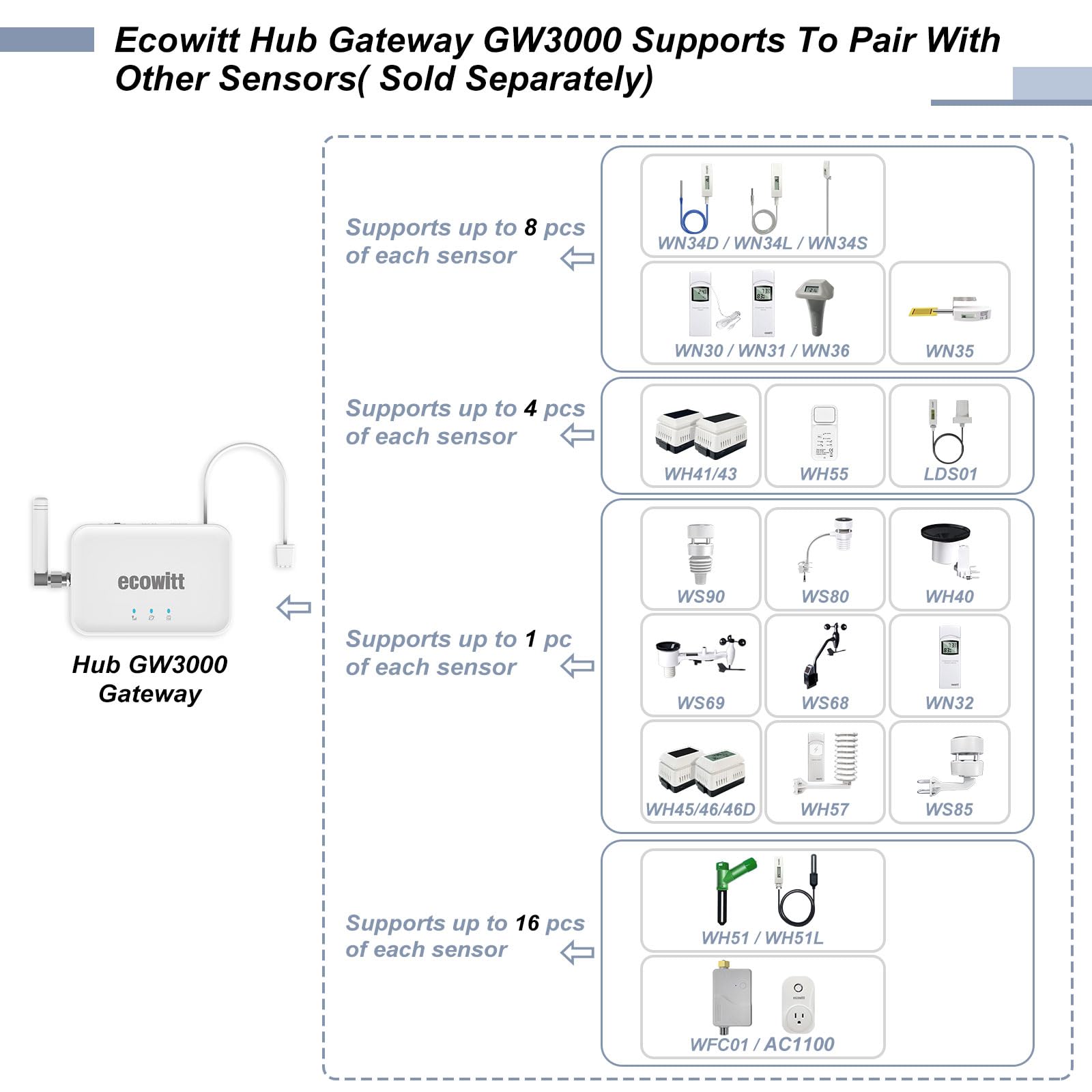 Das GW3000 ist das Herzstück eines flexibel erweiterbaren Wetter-Ökosystems. Es ist mit einer breiten Palette von optionalen Ecowitt Funksensoren (868 MHz Frequenz) kompatibel, darunter Wind- und Regensensoren, Bodenfeuchtesensoren, PM2.5-Feinstaubsensoren und sogar Wasserleckmelder.