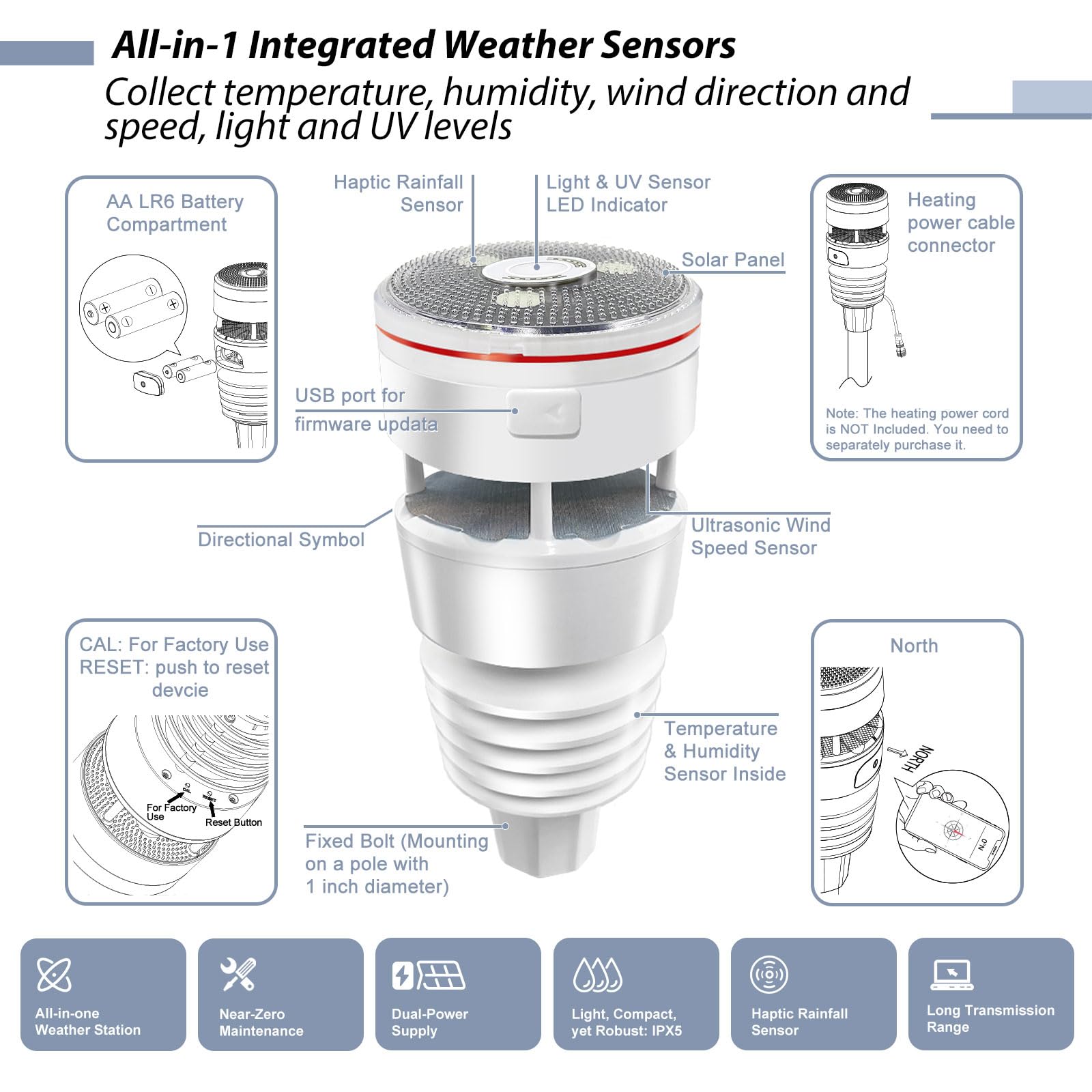 - Fortschrittlicher 7-in-1 Aussensensor (WS90): Die solarbetriebene Ausseneinheit misst zuverlässig Aussentemperatur, Luftfeuchtigkeit, Windgeschwindigkeit und -richtung (mittels Ultraschall), Niederschlagsmenge (haptischer Sensor) sowie Lichtintensität und UV-Strahlung.